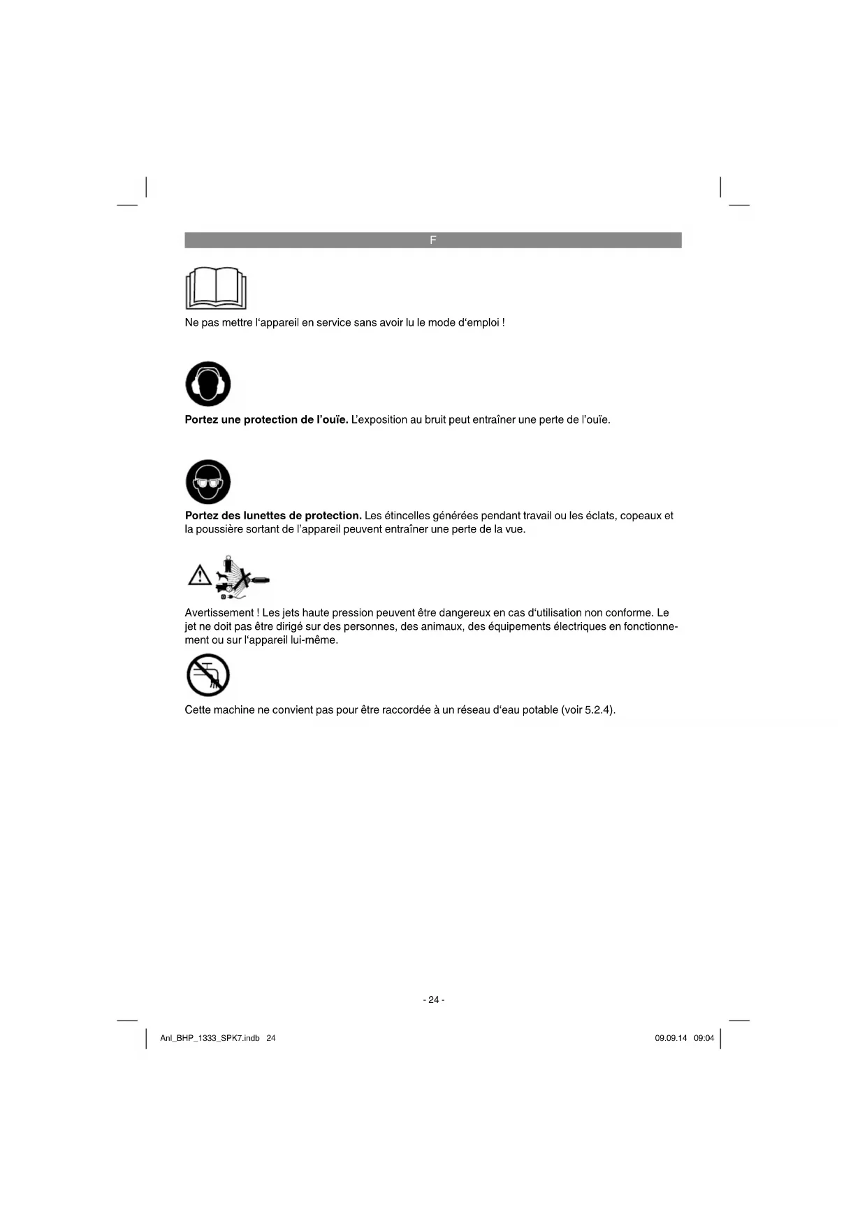 Portez une protection de l’ouïe. L’exposition au bruit peut entraîner une perte de l’ouïe. Portez des lunettes de protection. Les étincelles générées pendant travail ou les éclats, copeaux et la poussière sortant de l’appareil peuvent entraîner une perte de la vue. Ne pas mettre l‘appareil en service sans avoir lu le mode d‘emploi ! Avertissement ! Les jets haute pression peuvent être dangereux en cas d‘utilisation non conforme. Le jet ne doit pas être dirigé sur des personnes, des animaux, des équipements électriques en fonctionne- ment ou sur l‘appareil lui-même. Cette machine ne convient pas pour être raccordée à un réseau d‘eau potable (voir 5.2.4). Anl_BHP_1333_SPK7.indb 24Anl_BHP_1333_SPK7.indb 24 09.09.14 09:0409.09.14 09:04F