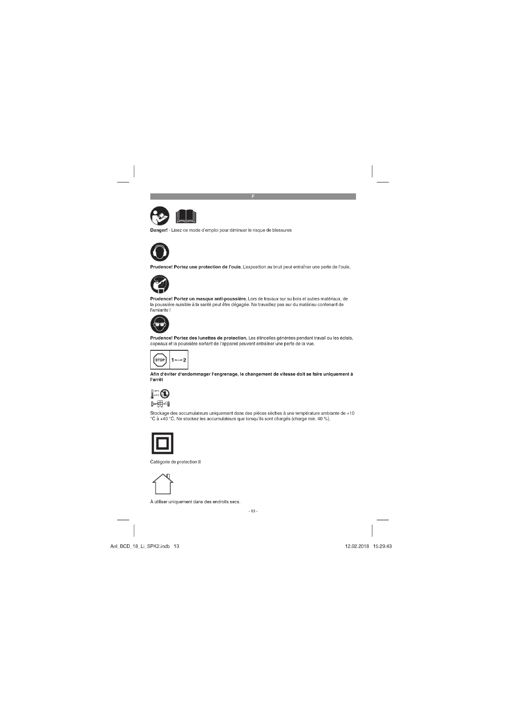 Danger! - Lisez ce mode d’emploi pour diminuer le risque de blessures Prudence! Portez une protection de l’ouïe. L’exposition au bruit peut entraîner une perte de l’ouïe. Prudence! Portez des lunettes de protection. Les étincelles générées pendant travail ou les éclats, copeaux et la poussière sortant de l’appareil peuvent entraîner une perte de la vue. Prudence! Portez un masque anti-poussière. Lors de travaux sur su bois et autres matériaux, de la poussière nuisible à la santé peut être dégagée. Ne travaillez pas sur du matériau contenant de l’amiante ! Afi n d‘éviter d‘endommager l‘engrenage, le changement de vitesse doit se faire uniquement à l‘arrêt Stockage des accumulateurs uniquement dans des pièces sèches à une température ambiante de +10 °C à +40 °C. Ne stockez les accumulateurs que lorsqu’ils sont chargés (charge min. 40 %). À utiliser uniquement dans des endroits secs. Catégorie de protection II Anl_BCD_18_Li_SPK2.indb 13Anl_BCD_18_Li_SPK2.indb 13 12.02.2018 15:29:4312.02.2018 15:29:43F