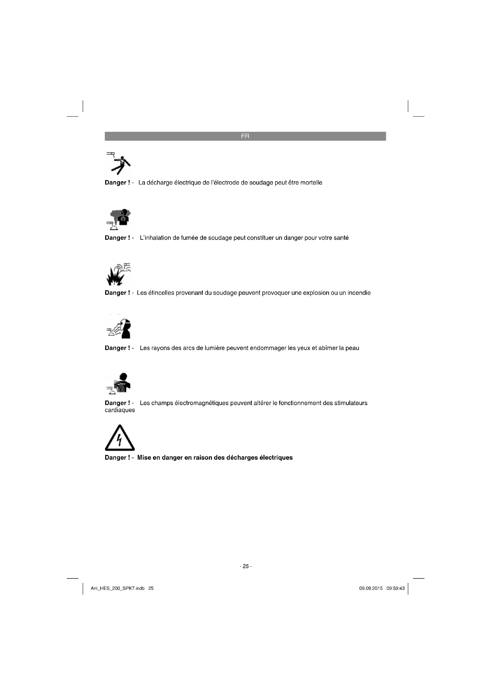 Danger ! - La décharge électrique de l’électrode de soudage peut être mortelle Danger ! - L’inhalation de fumée de soudage peut constituer un danger pour votre santé Danger ! - Les rayons des arcs de lumière peuvent endommager les yeux et abîmer la peau Danger ! - Les étincelles provenant du soudage peuvent provoquer une explosion ou un incendie Danger ! - Les champs électromagnétiques peuvent altérer le fonctionnement des stimulateurs cardiaques Danger ! - Mise en danger en raison des décharges électriques Anl_HES_200_SPK7.indb 25Anl_HES_200_SPK7.indb 25 09.09.2015 09:59:4309.09.2015 09:59:43FR