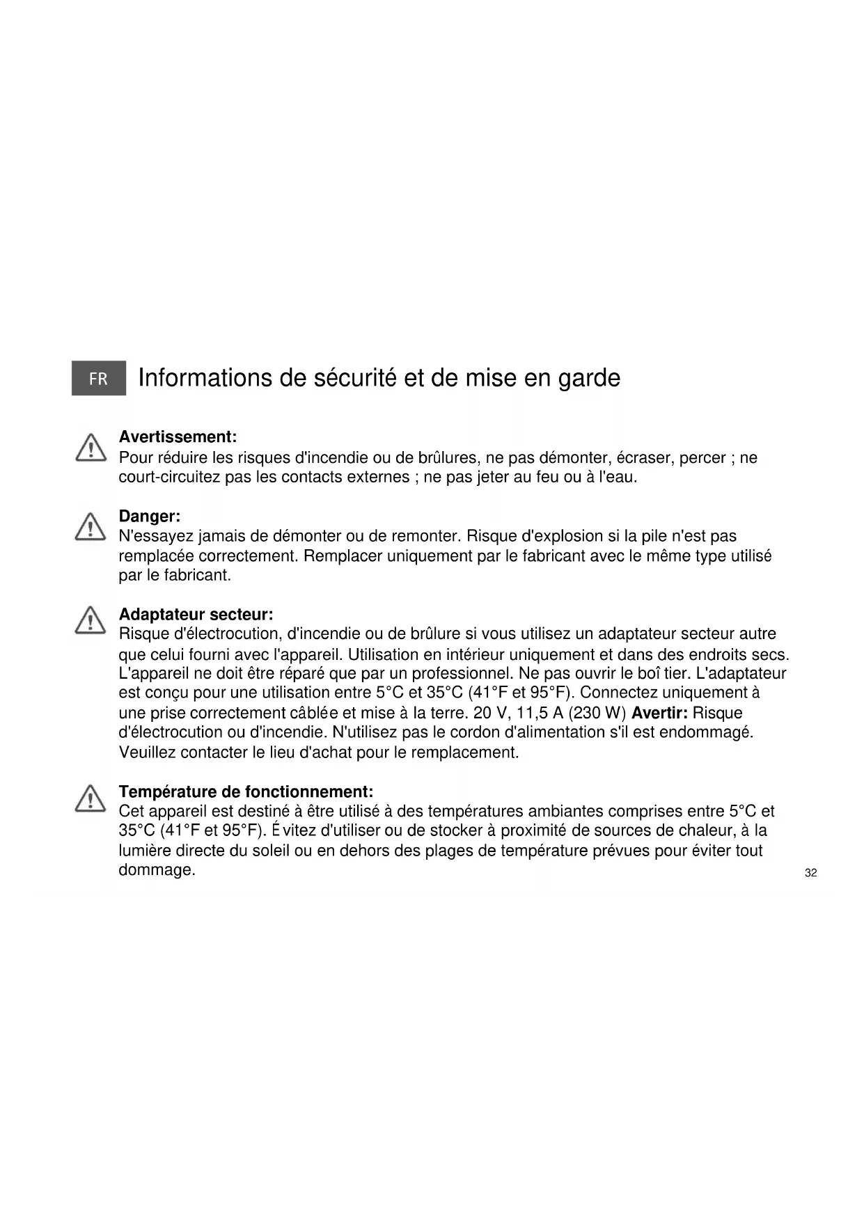 31Avertissement: Pour réduire les risques d'incendie ou de brûlures, ne pas démonter, écraser, percer ; ne court-circuitez pas les contacts externes ; ne pas jeter au feu ou à l'eau.