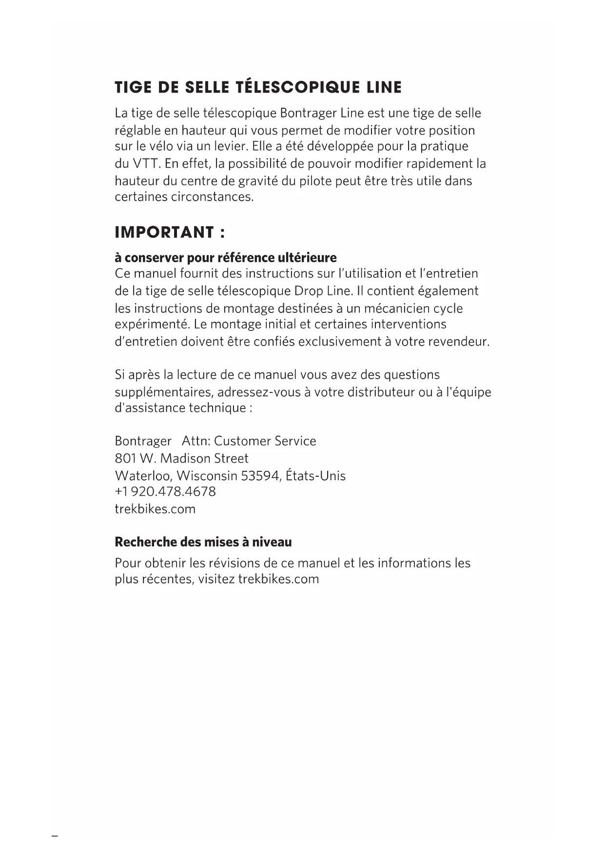 (consulta la sección Cómo usar la tija de sillín). GARANTÍA La tija telescópica Bontrager Drop Line está cubierta por una garantía. Para más información, entra en www.bontrager.com ADVERTENCIA: La colocación incorrecta de la tija de sillín o el diseño incorrecto de la abrazadera pueden romper los raíles del sillín o el tornillo de la abrazadera del sillín, provocando la caída del ciclista. Únicamente ancla la parte plana de los raíles de un sillín que ajuste correctamente en la abrazadera del sillín. Tija de sillínTIGE DE SELLE TÉLESCOPIQUE LINE La tige de selle télescopique Bontrager Line est une tige de selle réglable en hauteur qui vous permet de modifier votre position sur le vélo via un levier. Elle a été développée pour la pratique du VTT. En effet, la possibilité de pouvoir modifier rapidement la hauteur du centre de gravité du pilote peut être très utile dans certaines circonstances. IMPORTANT: à conserver pour référence ultérieure Ce manuel fournit des instructions sur l’utilisation et l’entretien de la tige de selle télescopique Drop Line. Il contient également les instructions de montage destinées à un mécanicien cycle expérimenté. Le montage initial et certaines interventions d’entretien doivent être confiés exclusivement à votre revendeur. Si après la lecture de ce manuel vous avez des questions supplémentaires, adressez-vous à votre distributeur ou à l'équipe d'assistance technique : Bontrager Attn: Customer Service 801 W. Madison Street Waterloo, Wisconsin 53594, États-Unis +1 920.478.4678 trekbikes.com Recherche des mises à niveau Pour obtenir les révisions de ce manuel et les informations les plus récentes, visitez trekbikes.comROULEZ EN SÉCURITÉ Le vélo peut être une immense source de plaisir, que vous l’utilisiez comme mode de transport, pour vous détendre, pour faire de l’exercice ou pour participer à des compétitions. Mais il peut également être dangereux, par exemple si vous essayez de rouler au-delà des limites de votre vélo ou de vos aptitudes. Ce manuel ne reprend pas toutes les informations de sécurité requises pour le cycliste. Lisez les informations relatives à la sécurité fournies dans le Manuel du cycliste avant d’utiliser cette tige de selle. Si vous ne possédez pas un exemplaire du Manuel du cycliste, rendez-vous sur trekbikes.com/manuals Signification des pictogrammes de sécurité et langue Dans ce manuel, le symbole d'alerte de sécurité est un triangle renfermant un point d'exclamation. Il indique toute situation qui, si elle n'est pas évitée, pourrait provoquer une blessure.