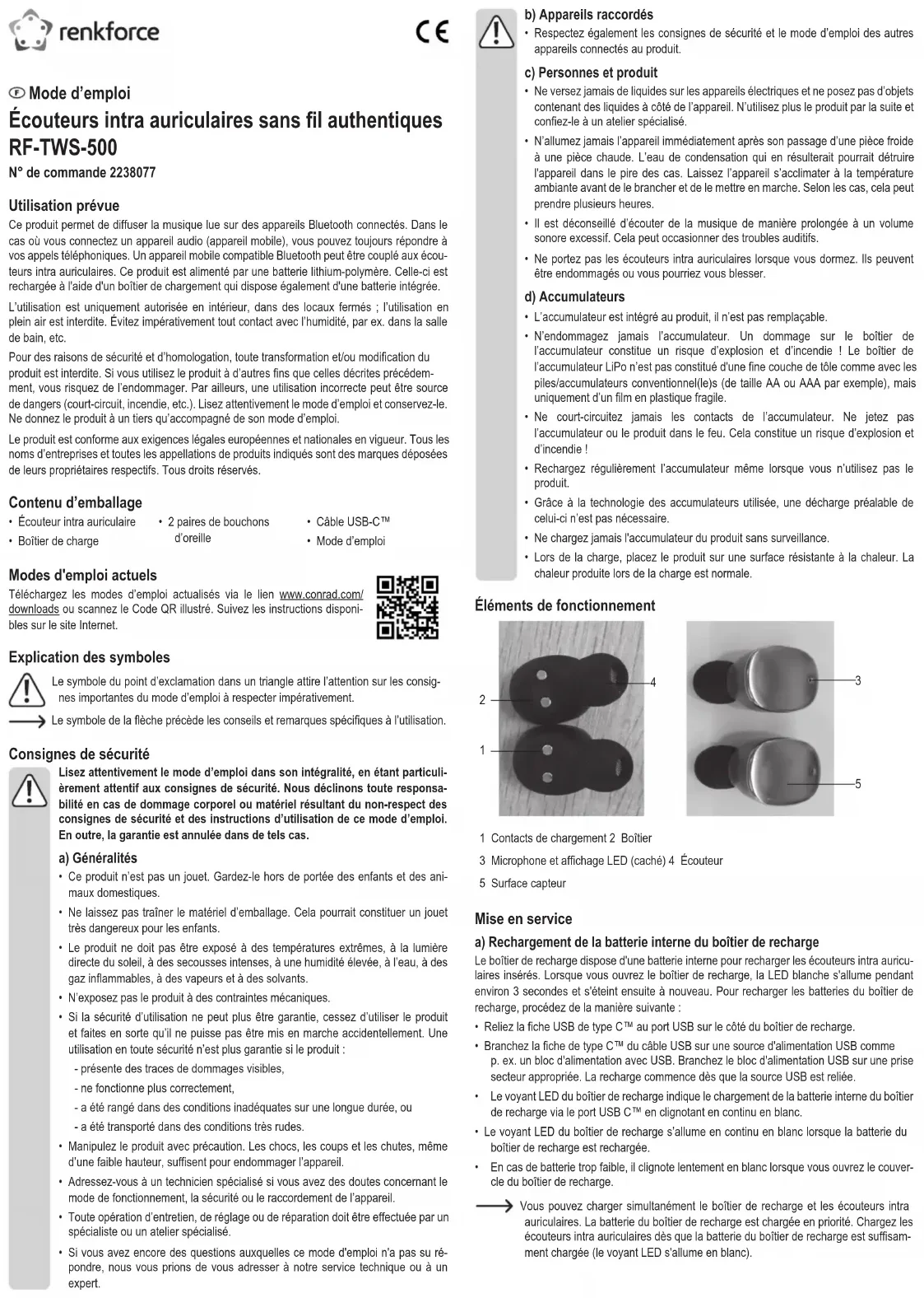 - Écouteur intra auriculaire • Boîtier de charge• 2 paires de bouchons d’oreille• Câble USB-C™• Mode d’emploi Modes d'emploi actuels Téléchargez les modes d’emploi actualisés via le lien www.conrad.com/downloads ou scannez le Code QR illustré. Suivez les instructions disponi-bles sur le site Internet. Explication des symboles Le symbole du point d’exclamation dans un triangle attire l’attention sur les consig-nes importantes du mode d’emploi à respecter impérativement. Le symbole de la èche précède les conseils et remarques spéciques à l’utilisation. Consignes de sécurité Lisez attentivement le mode d’emploi dans son intégralité, en étant particuli-èrement attentif aux consignes de sécurité. Nous déclinons toute responsa-bilité en cas de dommage corporel ou matériel résultant du non-respect des consignes de sécurité et des instructions d’utilisation de ce mode d’emploi. En outre, la garantie est annulée dans de tels cas. a) Généralités