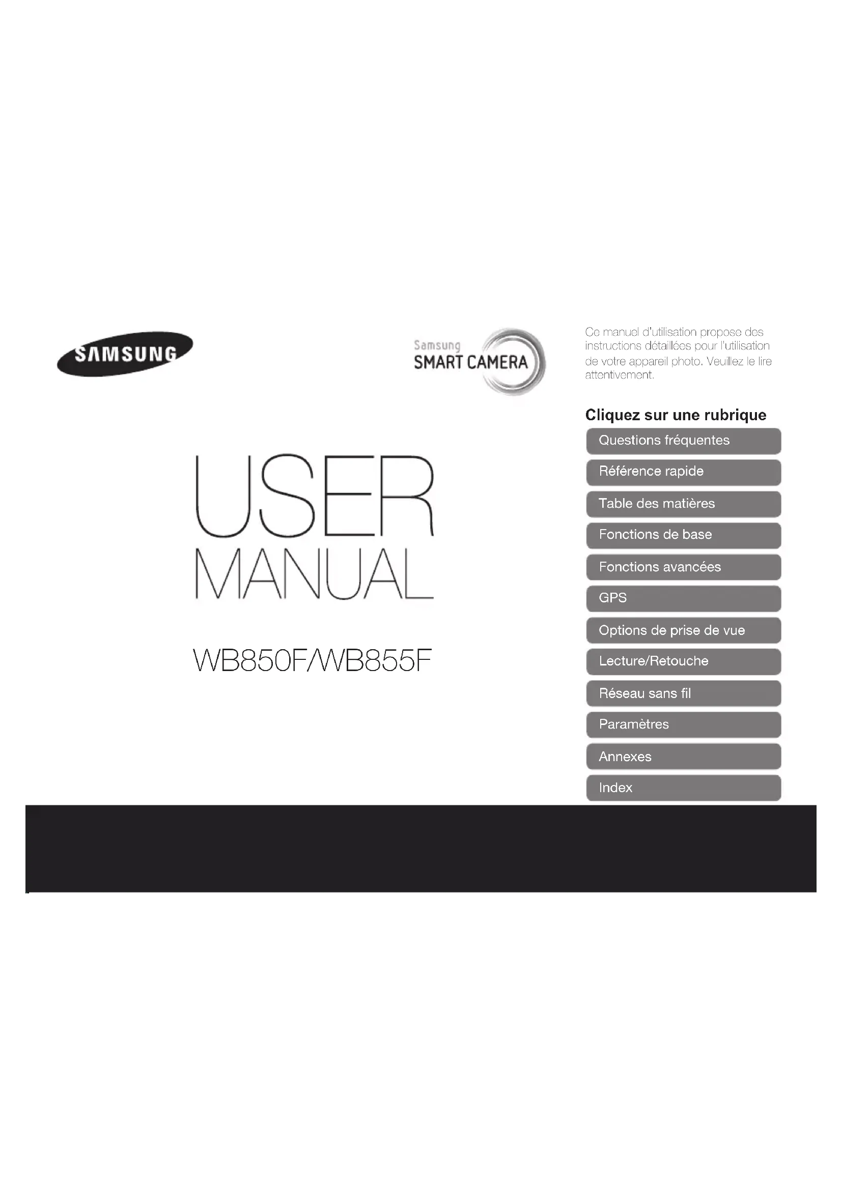 Ce manuel d’utilisation propose des instructions détaillées pour l’utilisation de votre appareil photo. Veuillez le lire attentivement. Cliquez sur une rubrique Questions fréquentes Référence rapide Table des matières Fonctions de base Fonctions avancées GPS Options de prise de vue Lecture/Retouche Réseau sans fil Paramètres Annexes Index WB850F/WB855F1 Evitez d’endommager la vue des sujets photographiés. N’utilisez pas le flash à proximité (à moins d’un mètre) de personnes ou d’animaux. L’utilisation du flash trop près des yeux du sujet peut provoquer des lésions temporaires ou permanentes. Ne laissez pas l’appareil photo à la portée d’enfants en bas âge ou d’animaux domestiques. Tenez l’appareil, ses pièces et ses accessoires, hors de portée des enfants en bas âge et des animaux. L’ingestion de petites pièces peut provoquer un étouffement ou des blessures graves. Les composants et les accessoires peuvent également présenter des risques de blessure. Evitez toute exposition prolongée de l’appareil photo à la lumière directe du soleil ou à des températures élevées. Une exposition prolongée à la lumière directe du soleil ou à des températures très élevées peut endommager de manière permanente les composants internes de l’appareil photo. Informations relatives à la santé et à la sécurité Respectez toujours les consignes et conseils d’utilisation suivants afin de prévenir toute situation dangereuse et de garantir un fonctionnement optimal de votre appareil photo. Avertissement—situations susceptibles de vous blesser ou de blesser d’autres personnes Ne démontez pas ou n’essayez pas de réparer vous-même votre appareil photo. Vous pouvez recevoir une décharge électrique ou endommager l’appareil photo. N’utilisez pas l’appareil photo à proximité de gaz ou de liquides inflammables ou explosifs. Vous risquez de provoquer une explosion ou un incendie. Ne laissez pas pénétrer de matériaux inflammables dans l’appareil photo ou ne stockez pas ces matériaux à proximité de l’appareil photo. Vous risquez de recevoir une décharge électrique ou de provoquer un incendie. N’utilisez pas l’appareil photo avec les mains mouillées. Vous pouvez recevoir une décharge électrique.2 Evitez de couvrir l’appareil photo ou le chargeur avec des couvertures ou des vêtements. L’appareil photo peut surchauffer, se déformer ou prendre feu. Ne manipulez pas le cordon d’alimentation ou ne vous approchez pas du chargeur lors d’un orage. Vous pourriez recevoir une décharge électrique. Si du liquide ou des corps étrangers pénètrent dans l’appareil photo, déconnectez toutes les sources d’alimentation comme la batterie ou le chargeur, puis contactez un service après-vente de Samsung. Respectez la réglementation interdisant l'utilisation des appareils photo dans certaines zones spécifiques.