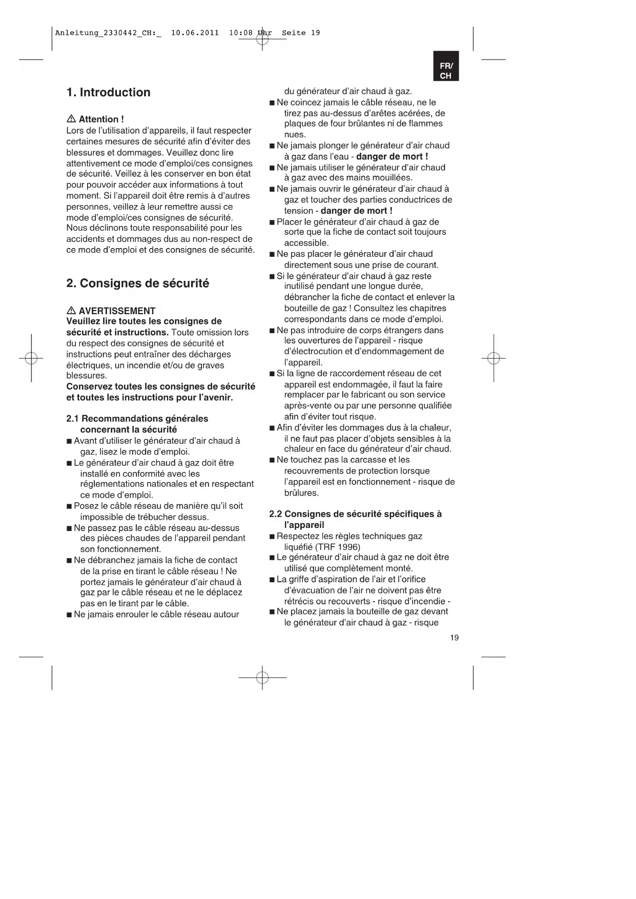 Anleitung_2330442_CH:_ 10.06.2011 10:08 Uhr Seite 19d’incendie - ■ Le générateur d’air chaud à gaz ne doit pas être utilisé sur une surface facilement inflammable - risque d’incendie - ■ Le générateur d’air chaud à gaz doit être utilisé sur une surface plate, non inclinée, incombustible et stable. ■ Le générateur d’air chaud à gaz est uniquement destiné à l’usage domestique. ■ Les pièces dans lesquelles l’appareil se trouve, doivent être suffisamment aérées et ventilées. Il faut prévoir des ouvertures d’aération et d’échappement d’au moins 450 cm