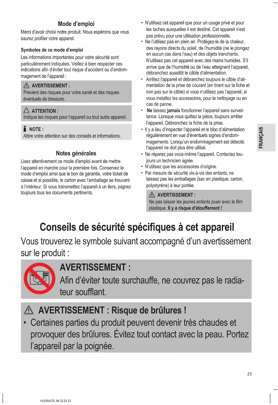 - Certaines parties du produit peuvent devenir très chaudes et provoquer des brûlures. Évitez tout contact avec la peau. Portez l’appareil par la poignée.HL6064CB_IM 22.03.23