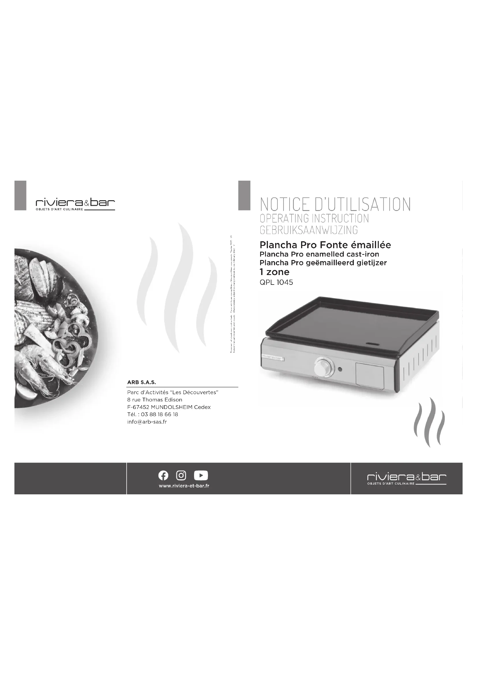 Anomalies de fonctionnement Causes Solutions L’appareil ne fonctionne pas. L’alimentation est coupée. Vérifiez que le cordon d’alimentation de l’appareil soit correctement branché et que l'interrupteur "Marche/Arrêt" soit positionné sur Marche ("I"). Sinon vérifiez le disjoncteur ou les fusibles de votre installation électrique. L’appareil fume lors de la première utilisation. Il est normal que l’appareil dégage de la fumée lors de sa première utilisation. Nettoyez la plaque avec un linge humide avant de mettre l'appareil en fonction. Les aliments ne saisissent pas et la cuisson se fait difficilement. La température choisie n’est pas adaptée à vos aliments. Réajustez la température choisie. Beaucoup de fumée se dégage lors de la cuisson des aliments. Vos aliments sont trop graissés. La matière grasse facilite en effet le dégagement de fumée. Graissez moins, voire pas du tout, la plaque de cuisson. L'appareil dégage une odeur de plastique fondu lors de l'utilisation. Le film de protection sur les 3 côtés du corps de l'appareil n'a pas été retiré. Enlevez correctement le film de protection et à l'aide d'eau savonneuse et d'un linge doux, retirez toutes les traces résiduelles. Guide de déPannaGe Puissance : 1800 W Tension d'utilisation : 230 V ~ 50–60 Hz Poids : 13 kg Dimensions : L 450 x H 165 x P 420 mm caRactéRistiques techniques Vous trouverez l’ensemble des accessoires de nos pro- duits sur notre site www.accessoires-electromenager.fr Toute utilisation de produits non recommandés par Riviera-et-Bar entraîne l’annulation de la garantie. Pour toute intervention du service après-vente Riviera- et-Bar, il vous sera demandé de retourner le produit sous son conditionnement initial afin d’éviter tout dommage supplémentaire lié au transport. Nous vous invitons donc à conserver l’emballage d’origine dans son intégralité, y compris les cales internes à l’emballage. En cas d’expédition de l’appareil, veillez à le positionner dans le bon sens dans son emballage d’origine et à le protéger à l’aide des cales. PRéconisations d’emBallaGe accessoiRes enviRonnement GaRantie Merci de respecter les recommandations ci-dessous : - Vous ne devez pas vous débarrasser de cet appareil avec vos déchets ménagers. - Un système de collecte sélective pour ce type de produit est mis en place par les communes, vous devez vous renseigner auprès de votre mairie afin d’en connaître les emplacements. En effet, les produits électriques et électroniques contiennent des substances dangereuses qui ont des effets néfastes sur l’environnement ou la santé humaine et qui doivent être recyclées.17