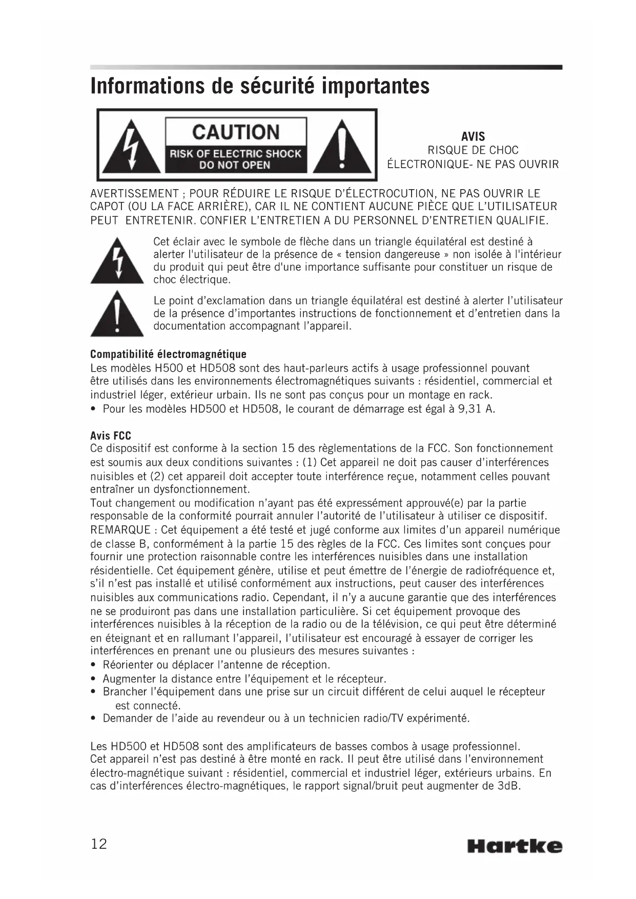 Rated Output Power 500 watts Peak / 250 watts RMS Rated Input Level 77.46mv rms (@1kHz) Total Harmonic Distortion 0.54% (@1dB below rated output, 1kHz typical) Signal To Noise Ratio 1W/49.3dBu (1Wrms @1kHz) Signal Gain Speaker Output 37.1Vrms Signal Gain to Direct Out 4.2Vrms Equalizer Center Frequency Bass 70Hz Midrange 700Hz Treble 5kHz Shape Control 100Hz - 900Hz Fuse Rating 220V-240V:T2AL AC250V 100V-120V:T4AL AC250V Weight 34.39lb 15.6kg Dimensions (LxWxH) 19.6” x 12” x 20.27” 498mm x 305mm x 515mm Specifications At Hartke, we are continually improving our products, therefore specifications and images are subject to change without notice.12 Informations de sécurité importantes AVERTISSEMENT; POUR RÉDUIRE LE RISQUE D’ÉLECTROCUTION, NE PAS OUVRIR LE CAPOT (OU LA FACE ARRIÈRE), CAR IL NE CONTIENT AUCUNE PIÈCE QUE L’UTILISATEUR PEUT ENTRETENIR. CONFIER L’ENTRETIEN A DU PERSONNEL D’ENTRETIEN QUALIFIE. Cet éclair avec le symbole de flèche dans un triangle équilatéral est destiné à alerter l'utilisateur de la présence de «tension dangereuse» non isolée à l'intérieur du produit qui peut être d'une importance suffisante pour constituer un risque de choc électrique. Le point d’exclamation dans un triangle équilatéral est destiné à alerter l’utilisateur de la présence d’importantes instructions de fonctionnement et d’entretien dans la documentation accompagnant l’appareil. AVIS