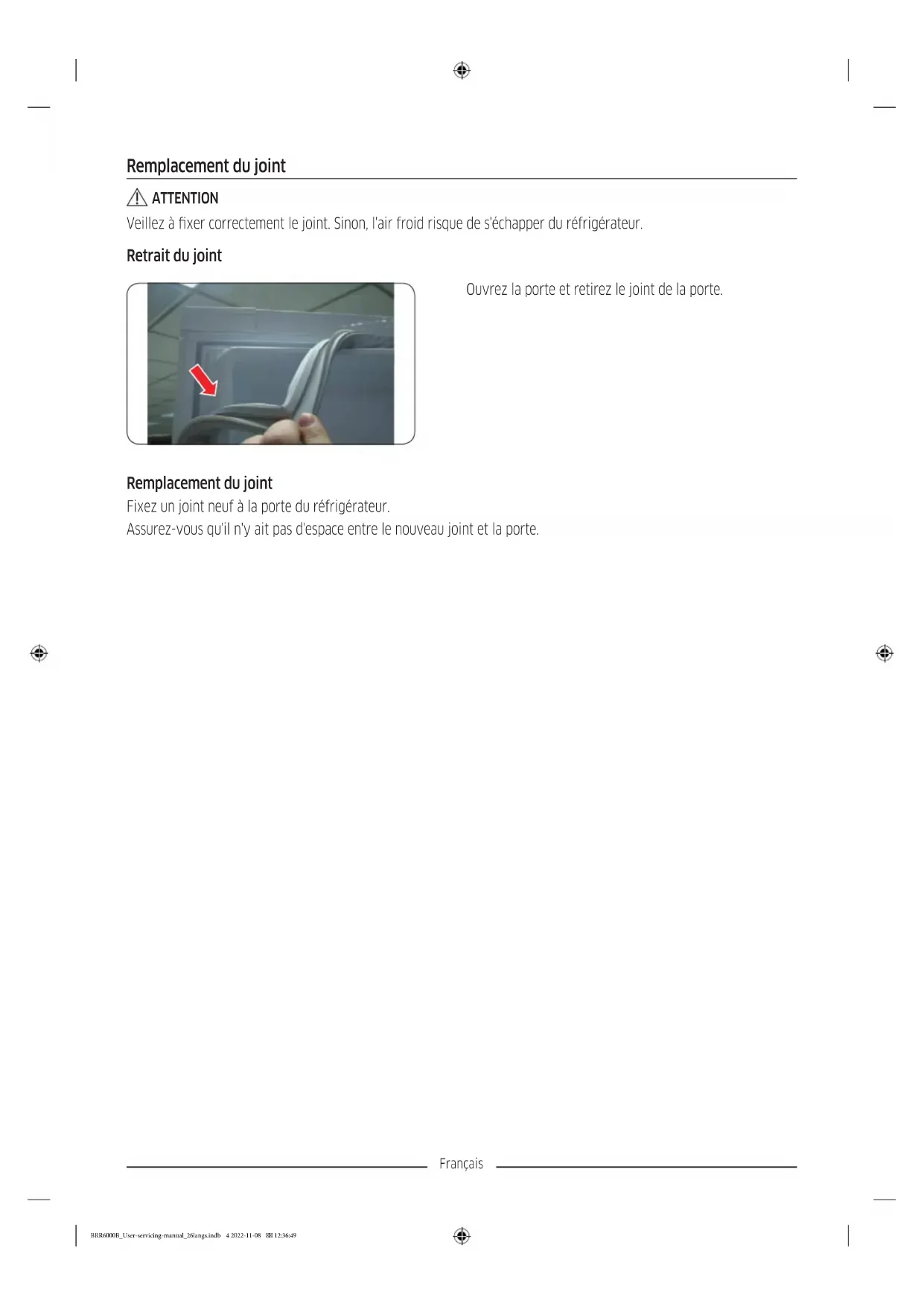 01 Panneau principal 02 Clayette 03 Tiroir (normal/gros) 04 Étiquette du code à barres BRR6000B_User-servicing-manual_26langs.indb 3 2022-11-08 12:36:49Français Remplacement du joint ATTENTION Veillez à xer correctement le joint. Sinon, l'air froid risque de s'échapper du réfrigérateur. Retrait du joint Ouvrez la porte et retirez le joint de la porte. Remplacement du joint Fixez un joint neuf à la porte du réfrigérateur. Assurez-vous qu'il n'y ait pas d'espace entre le nouveau joint et la porte. BRR6000B_User-servicing-manual_26langs.indb 4 2022-11-08 12:36:49Français Remplacement du tiroir ATTENTION Vériez que le tiroir est correctement inséré dans le rail durant l'assemblage. Retrait du tiroir Soulevez doucement l'avant du tiroir et faites-le glisser pour le retirer. Réinstallation des tiroirs Pour réinstaller les tiroirs, suivez la procédure dans le sens inverse de leur retrait. Remplacement de la charnière Pour remplacer les charnières, vous devez commencer par retirer les portes. AVERTISSEMENT