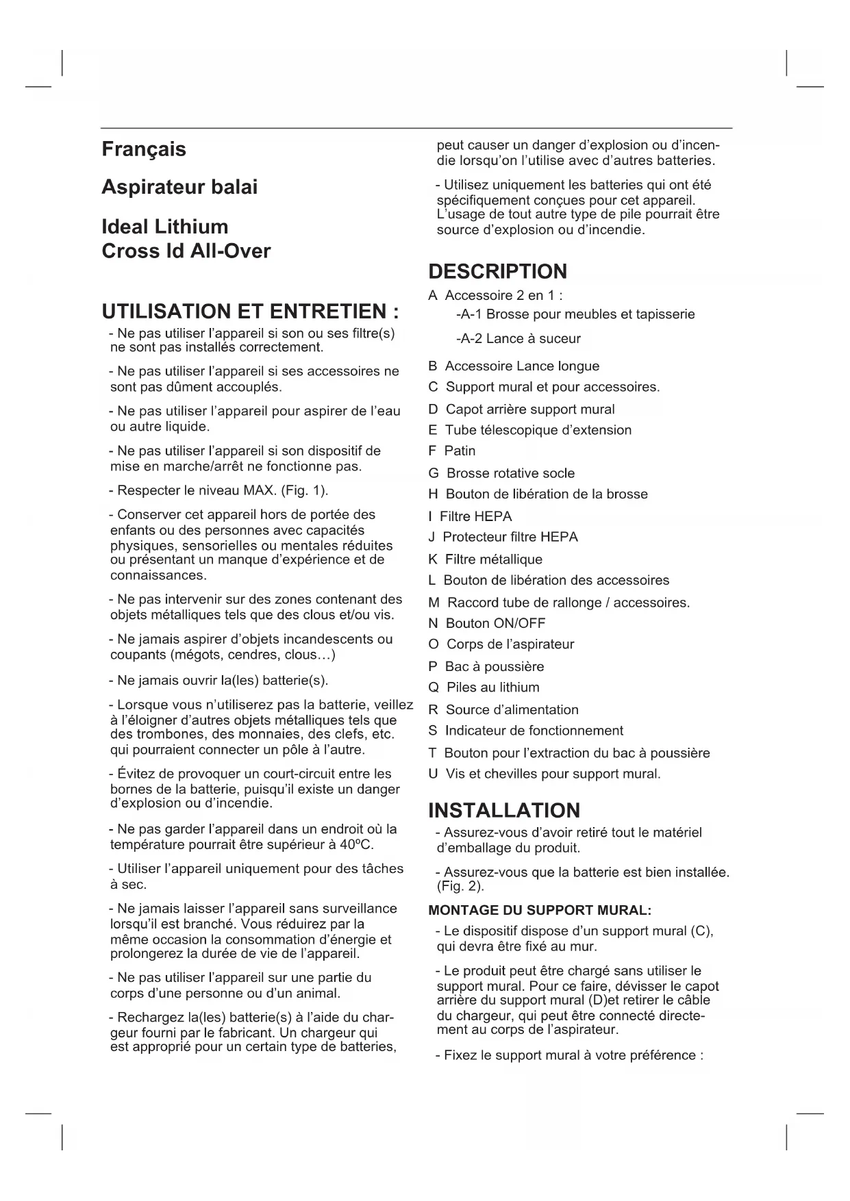 FOLLOWS: - Pull the battery upward to remove it from its housing. (Fig. 11).Français Aspirateur balai Ideal Lithium Cross Id All-Over UTILISATION ET ENTRETIEN : - Ne pas utiliser l’appareil si son ou ses ltre(s) ne sont pas installés correctement. - Ne pas utiliser l’appareil si ses accessoires ne sont pas dûment accouplés. - Ne pas utiliser l’appareil pour aspirer de l’eau ou autre liquide. - Ne pas utiliser l’appareil si son dispositif de mise en marche/arrêt ne fonctionne pas. - Respecter le niveau MAX. (Fig. 1). - Conserver cet appareil hors de portée des enfants ou des personnes avec capacités physiques, sensorielles ou mentales réduites ou présentant un manque d’expérience et de connaissances. - Ne pas intervenir sur des zones contenant des objets métalliques tels que des clous et/ou vis. - Ne jamais aspirer d’objets incandescents ou coupants (mégots, cendres, clous…) - Ne jamais ouvrir la(les) batterie(s). - Lorsque vous n’utiliserez pas la batterie, veillez à l’éloigner d’autres objets métalliques tels que des trombones, des monnaies, des clefs, etc. qui pourraient connecter un pôle à l’autre. - Évitez de provoquer un court-circuit entre les bornes de la batterie, puisqu’il existe un danger d’explosion ou d’incendie. - Ne pas garder l’appareil dans un endroit où la température pourrait être supérieur à 40ºC. - Utiliser l’appareil uniquement pour des tâches à sec. - Ne jamais laisser l’appareil sans surveillance lorsqu’il est branché. Vous réduirez par la même occasion la consommation d’énergie et prolongerez la durée de vie de l’appareil. - Ne pas utiliser l’appareil sur une partie du corps d’une personne ou d’un animal. - Rechargez la(les) batterie(s) à l’aide du char- geur fourni par le fabricant. Un chargeur qui est approprié pour un certain type de batteries, peut causer un danger d’explosion ou d’incen- die lorsqu’on l’utilise avec d’autres batteries. - Utilisez uniquement les batteries qui ont été spéciquement conçues pour cet appareil. L’usage de tout autre type de pile pourrait être source d’explosion ou d’incendie. DESCRIPTION A Accessoire 2 en 1 : -A-1 Brosse pour meubles et tapisserie -A-2 Lance à suceur B Accessoire Lance longue C Support mural et pour accessoires. D Capot arrière support mural E Tube télescopique d’extension F Patin G Brosse rotative socle H Bouton de libération de la brosse I Filtre HEPA J Protecteur ltre HEPA K Filtre métallique L Bouton de libération des accessoires M Raccord tube de rallonge / accessoires. N Bouton ON/OFF O Corps de l’aspirateur P Bac à poussière Q Piles au lithium R Source d’alimentation S Indicateur de fonctionnement T Bouton pour l’extraction du bac à poussière U Vis et chevilles pour support mural. INSTALLATION - Assurez-vous d’avoir retiré tout le matériel d’emballage du produit. - Assurez-vous que la batterie est bien installée. (Fig. 2). MONTAGE DU SUPPORT MURAL: - Le dispositif dispose d’un support mural (C), qui devra être xé au mur. - Le produit peut être chargé sans utiliser le support mural. Pour ce faire, dévisser le capot arrière du support mural (D)et retirer le câble du chargeur, qui peut être connecté directe- ment au corps de l’aspirateur. - Fixez le support mural à votre préférence :avec des chevilles, des vis, des adhésifs… - S’assurer que le support est bien xé et qu’il est capable de soutenir au moins le double du poids de l’appareil. - Emboîter l’appareil dans son support mural.