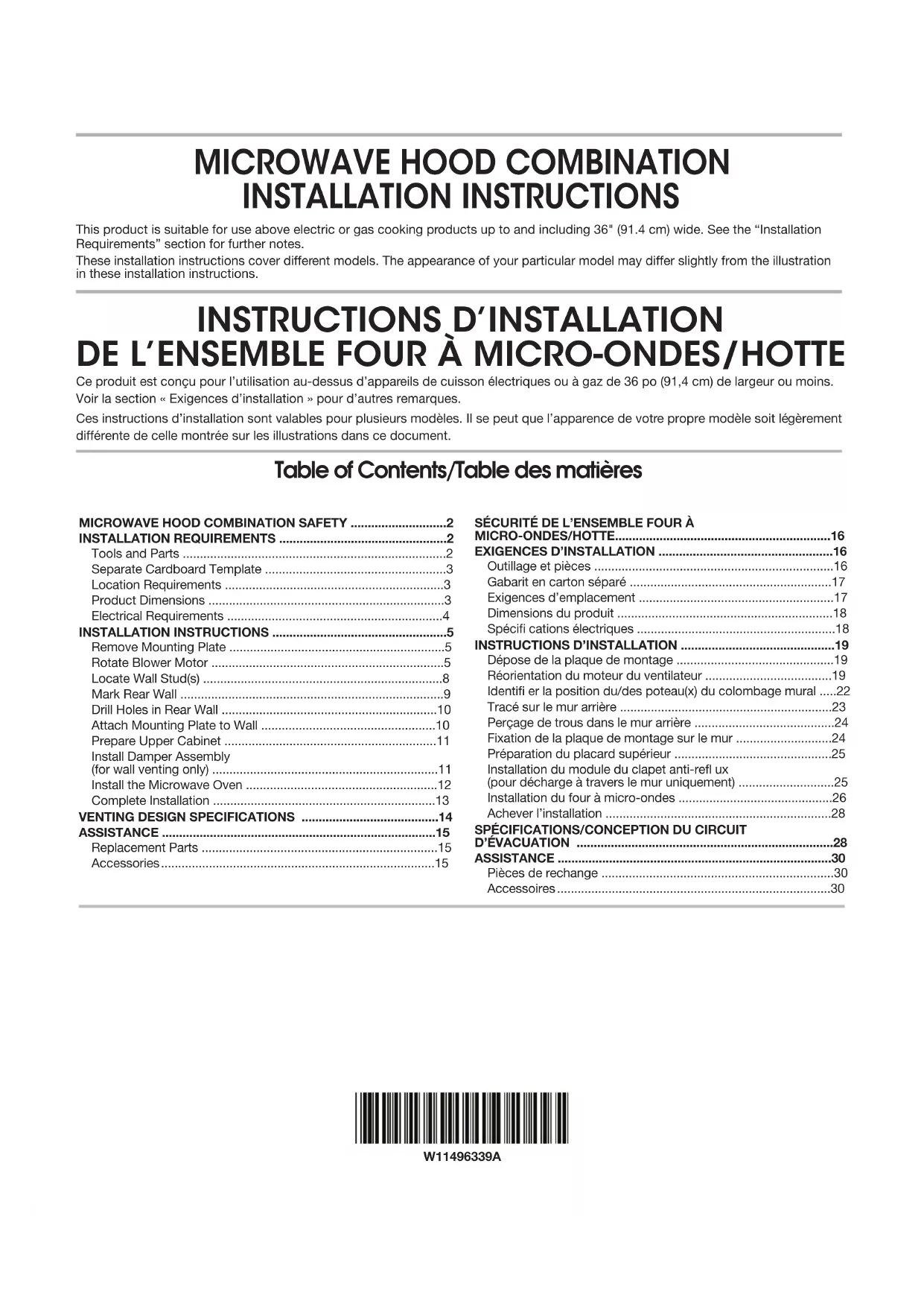 Ce produit est conçu pour l’utilisation au-dessus d’appareils de cuisson électriques ou à gaz de 36 po (91,4 cm) de largeur ou moins. Voir la section « Exigences d’installation » pour d’autres remarques. Ces instructions d’installation sont valables pour plusieurs modèles. Il se peut que l’apparence de votre propre modèle soit légèrement différente de celle montrée sur les illustrations dans ce document. Table of Contents/Table des matières W11496339A
