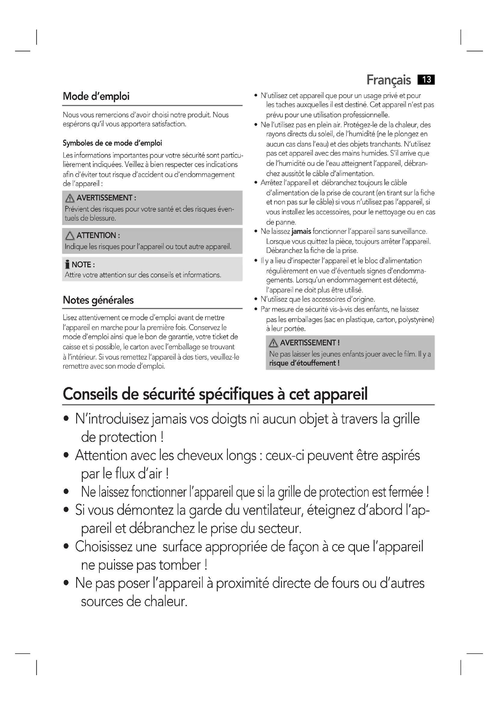 - Si vous démontez la garde du ventilateur, éteignez d’abord l’ap- pareil et débranchez le prise du secteur.