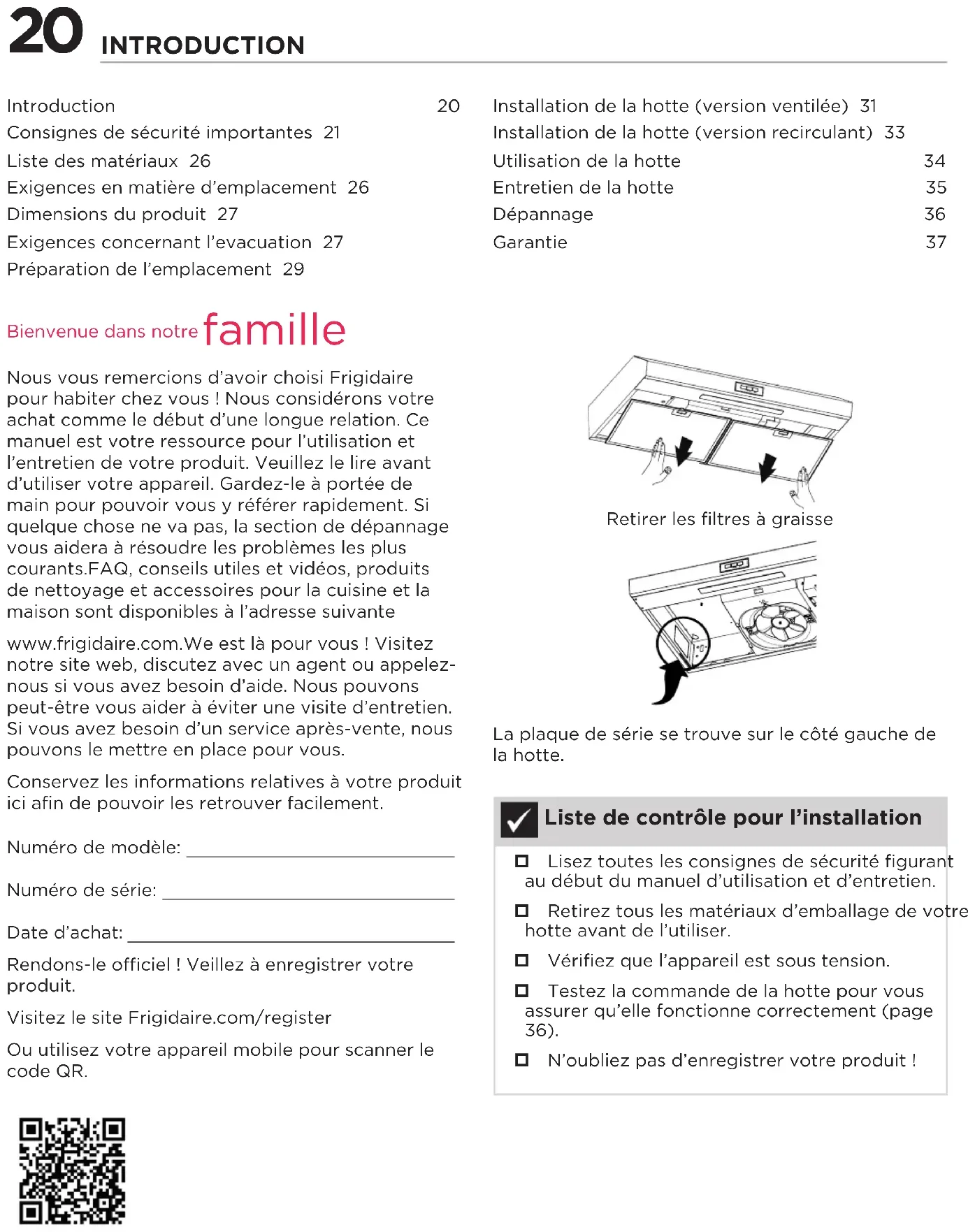 Electrolux Canada Corp. 5855 Terry Fox Way Mississauga, Ontario, Canada L5V 3E4Bienvenue dans notre famille Nous vous remercions d’avoir choisi Frigidaire pour habiter chez vous ! Nous considérons votre achat comme le début d’une longue relation. Ce manuel est votre ressource pour l’utilisation et l’entretien de votre produit. Veuillez le lire avant d’utiliser votre appareil. Gardez-le à portée de main pour pouvoir vous y référer rapidement. Si quelque chose ne va pas, la section de dépannage vous aidera à résoudre les problèmes les plus courants.FAQ, conseils utiles et vidéos, produits de nettoyage et accessoires pour la cuisine et la maison sont disponibles à l’adresse suivante www.frigidaire.com.We est là pour vous ! Visitez notre site web, discutez avec un agent ou appelez- nous si vous avez besoin d’aide. Nous pouvons peut-être vous aider à éviter une visite d’entretien. Si vous avez besoin d’un service après-vente, nous pouvons le mettre en place pour vous. Conservez les informations relatives à votre produit ici afin de pouvoir les retrouver facilement. Numéro de modèle: Numéro de série: Date d’achat: Rendons-le ociel ! Veillez à enregistrer votre produit. Visitez le site Frigidaire.com/register Ou utilisez votre appareil mobile pour scanner le code QR. Lisez toutes les consignes de sécurité figurant au début du manuel d’utilisation et d’entretien. Retirez tous les matériaux d’emballage de votre hotte avant de l’utiliser. Vérifiez que l’appareil est sous tension. Testez la commande de la hotte pour vous assurer qu’elle fonctionne correctement (page 36). N’oubliez pas d’enregistrer votre produit ! Liste de contrôle pour l’installation Retirer les filtres à graisse La plaque de série se trouve sur le côté gauche de la hotte. Introduction 20 Consignes de sécurité importantes 21 Liste des matériaux 26 Exigences en matière d’emplacement 26 Dimensions du produit 27 Exigences concernant l’evacuation 27 Préparation de l’emplacement 29 Installation de la hotte (version ventilée) 31 Installation de la hotte (version recirculant) 33 Utilisation de la hotte 34 Entretien de la hotte 35 Dépannage 36 Garantie 37