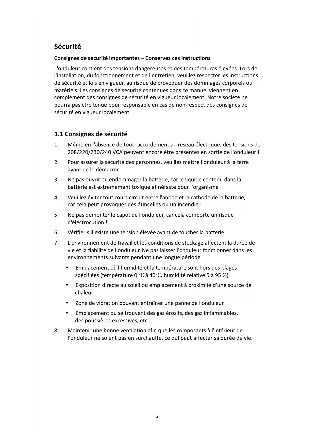 DN-170106 Rev. 2・DN-170107 Rev. 2 Guide d'installation rapide2 Sécurité Consignes de sécurité importantes – Conservez ces instructions L'onduleur contient des tensions dangereuses et des températures élevées. Lors de l'installation, du fonctionnement et de l'entretien, veuillez respecter les instructions de sécurité et lois en vigueur, au risque de provoquer des dommages corporels ou matériels. Les consignes de sécurité contenues dans ce manuel viennent en complément des consignes de sécurité en vigueur localement. Notre société ne pourra pas être tenue pour responsable en cas de non-respect des consignes de sécurité en vigueur localement.