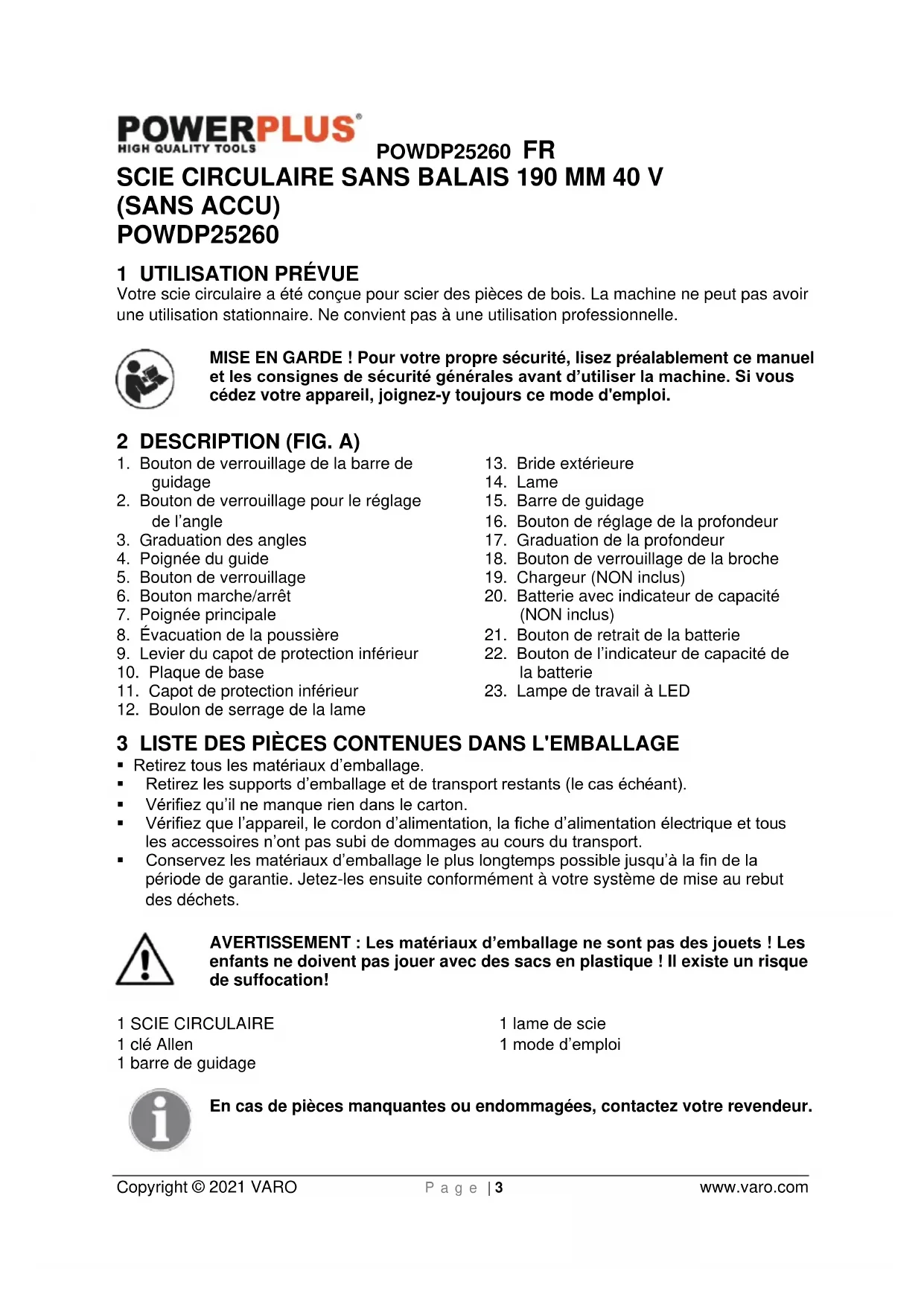 - Ne tenez jamais la pièce en cours de coupe dans vos mains et ne la placez jamais sur votre jambe. Fixez la pièce à usiner sur une plate-forme stable. Il est important que laPOWDP25260 FR Copyright © 2021 VARO P a g e | 7 www.varo.com pièce à travailler soit soutenue convenablement, afin de minimiser l’exposition du corps, le grippage de la lame ou la perte de contrôle.