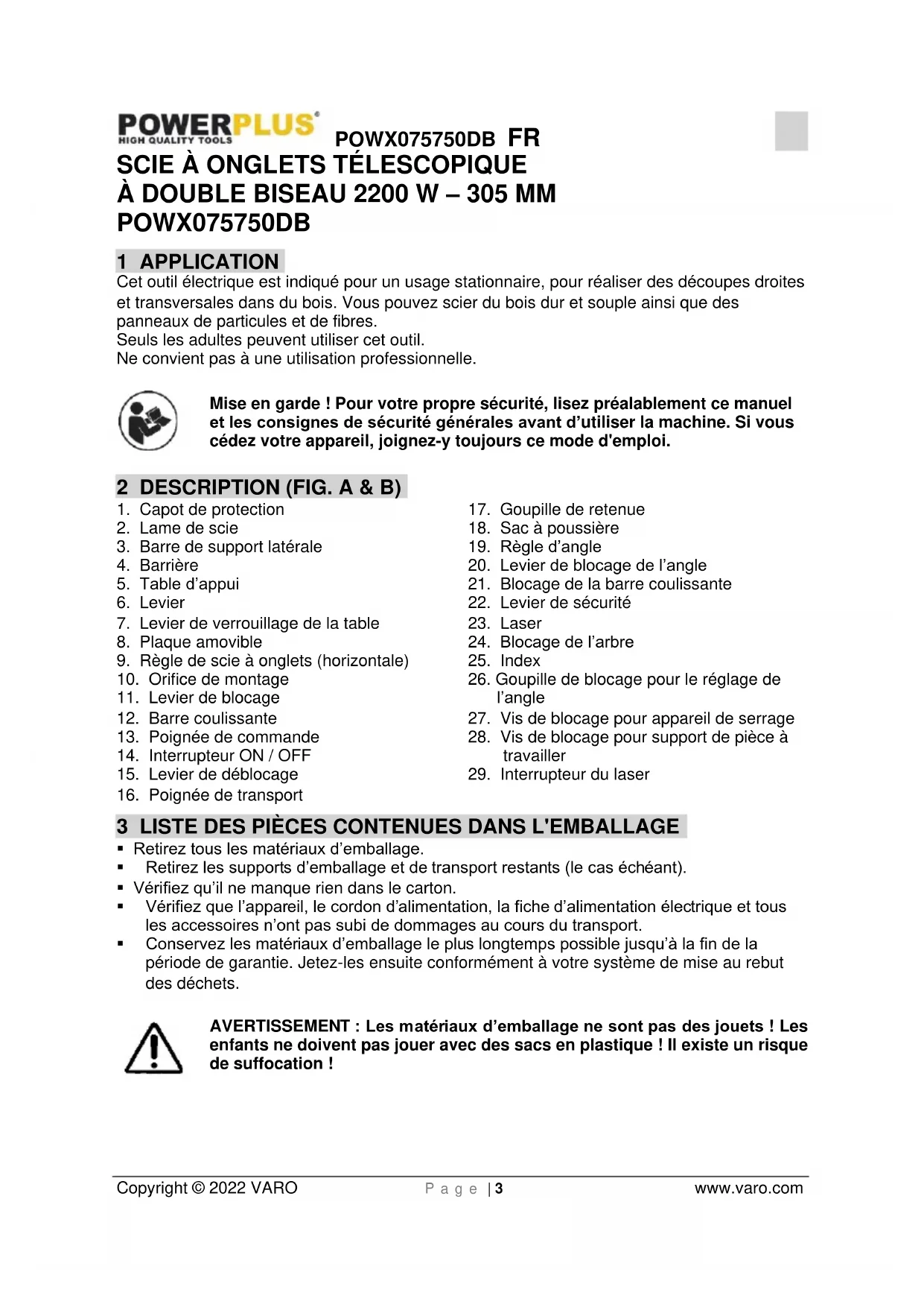 enfants ne doivent pas jouer avec des sacs en plastique ! Il existe un risque de suffocation !POWX075750DB FR Copyright © 2022 VARO P a g e | 4 www.varo.com Dans l’emballage, vous pouvez retrouver: 1 scie à onglets télescopique Clé hexagonale de 4 + 6 mm 1 pince 1 mode d’emploi 2 barres de support latérales 1 sac à poussière 2 barrières 1 poignée de transport En cas de pièces manquantes ou endommagées, contactez votre revendeur. 4 PICTOGRAMMES Les symboles suivants sont utilisés dans ce mode d’emploi et/ou sur la machine :