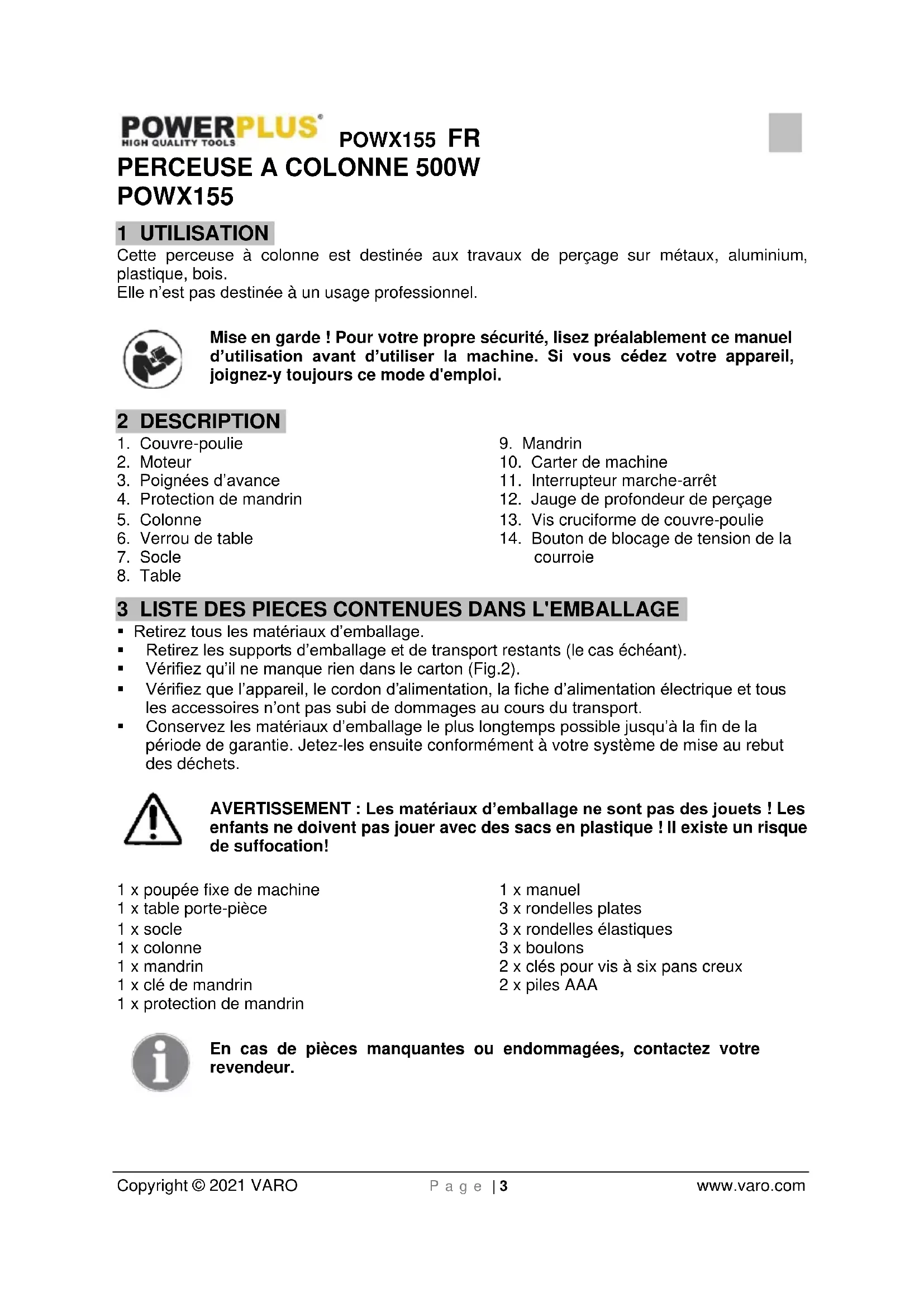enfants ne doivent pas jouer avec des sacs en plastique ! Il existe un risque de suffocation! 1 x poupée fixe de machine 1 x table porte-pièce 1 x socle 1 x colonne 1 x mandrin 1 x clé de mandrin 1 x protection de mandrin 1 x manuel 3 x rondelles plates 3 x rondelles élastiques 3 x boulons 2 x clés pour vis à six pans creux 2 x piles AAA En cas de pièces manquantes ou endommagées, contactez votre revendeur.POWX155 FR Copyright © 2021 VARO P a g e | 4 www.varo.com 4 PICTOGRAMMES Les symboles suivants sont utilisés dans ce mode d’emploi et/ou sur la machine :