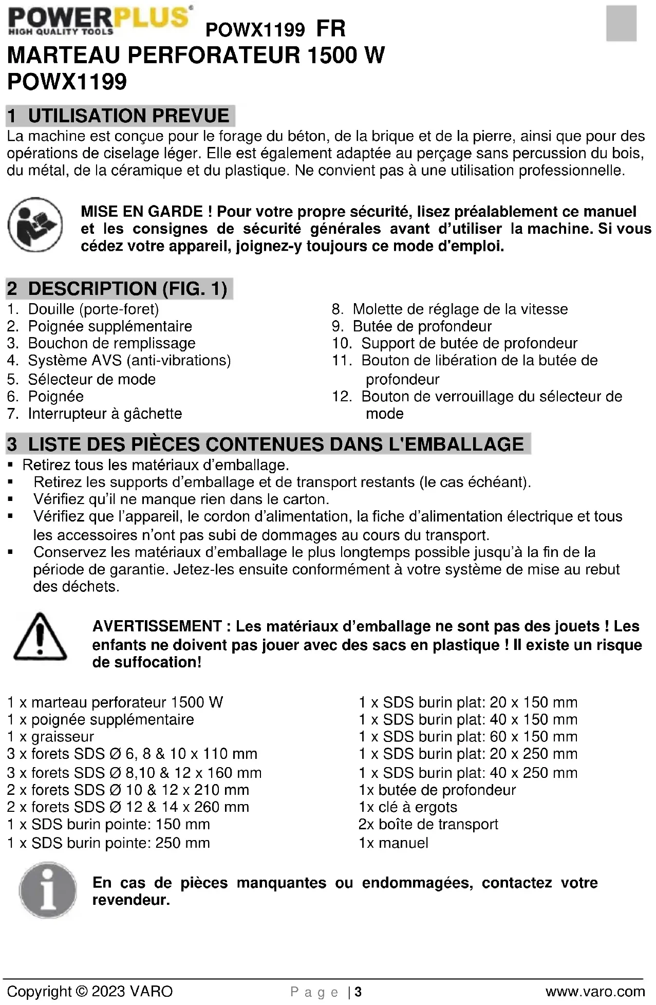 enfants ne doivent pas jouer avec des sacs en plastique ! Il existe un risque de suffocation! 1 x marteau perforateur 1500 W 1 x poignée supplémentaire 1 x graisseur 3 x forets SDS Ø 6, 8 & 10 x 110 mm 3 x forets SDS Ø 8,10 & 12 x 160 mm 2 x forets SDS Ø 10 & 12 x 210 mm 2 x forets SDS Ø 12 & 14 x 260 mm 1 x SDS burin pointe: 150 mm 1 x SDS burin pointe: 250 mm 1 x SDS burin plat: 20 x 150 mm 1 x SDS burin plat: 40 x 150 mm 1 x SDS burin plat: 60 x 150 mm 1 x SDS burin plat: 20 x 250 mm 1 x SDS burin plat: 40 x 250 mm 1x butée de profondeur 1x clé à ergots 2x boîte de transport 1x manuel En cas de pièces manquantes ou endommagées, contactez votre revendeur.POWX1199 FR Copyright © 2023 VARO P a g e | 4 www.varo.com 4 PICTOGRAMMES Les symboles suivants sont utilisés dans ce mode d’emploi et/ou sur la machine :