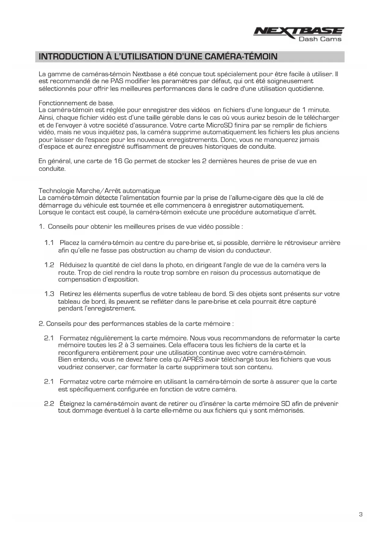 La gamme de caméras-témoin Nextbase a été conçue tout spécialement pour être facile à utiliser. Il est recommandé de ne PAS modifier les paramètres par défaut, qui ont été soigneusement sélectionnés pour offrir les meilleures performances dans le cadre d'une utilisation quotidienne. Fonctionnement de base. La caméra-témoin est réglée pour enregistrer des vidéos en fichiers d’une longueur de 1minute. Ainsi, chaque fichier vidéo est d’une taille gérable dans le cas où vous auriez besoin de le télécharger et de l’envoyer à votre société d’assurance. Votre carte MicroSD finira par se remplir de fichiers vidéo, mais ne vous inquiétez pas, la caméra supprime automatiquement les fichiers les plus anciens pour laisser de l'espace pour les nouveaux enregistrements. Donc, vous ne manquerez jamais d’espace et aurez enregistré suffisamment de preuves historiques de conduite. En général, une carte de 16Go permet de stocker les 2dernières heures de prise de vue en conduite. Technologie Marche/Arrêt automatique La caméra-témoin détecte l’alimentation fournie par la prise de l’allume-cigare dès que la clé de démarrage du véhicule est tournée et elle commencera à enregistrer automatiquement. Lorsque le contact est coupé, la caméra-témoin exécute une procédure automatique d’arrêt.