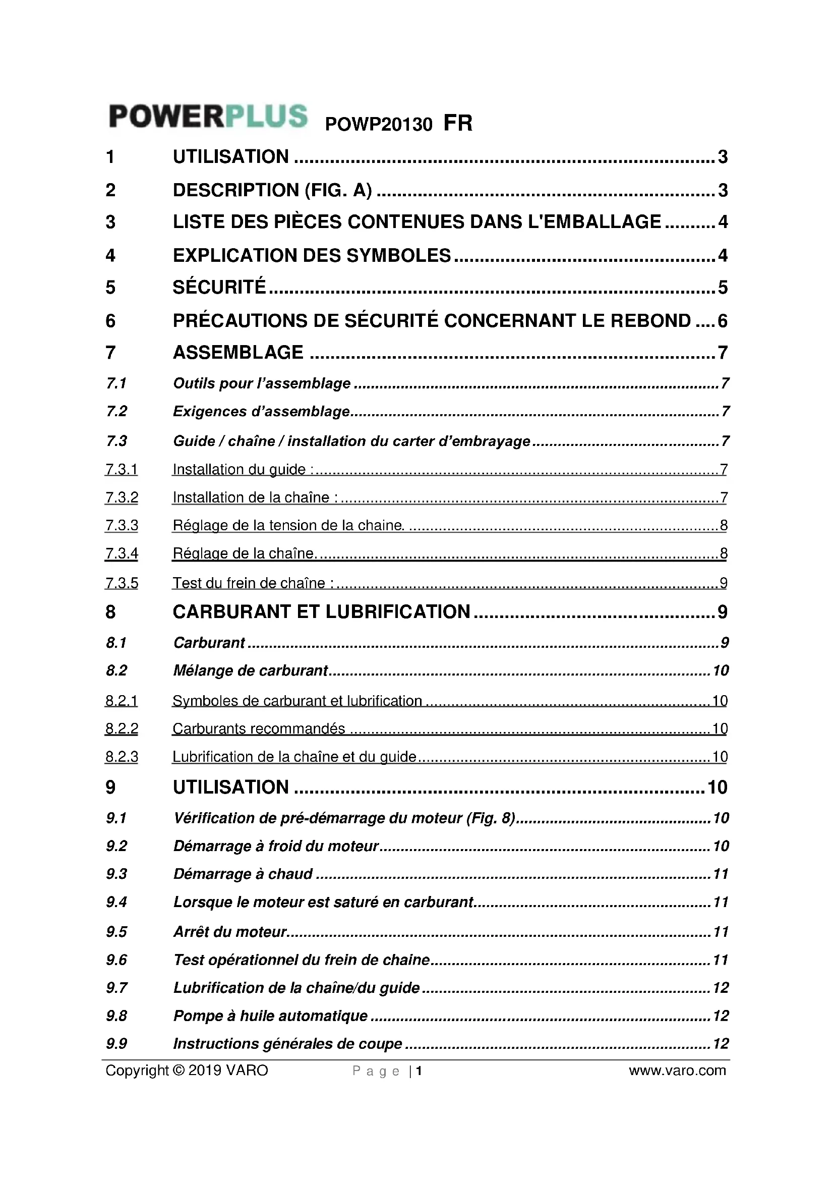 - L’ATTRAPE CHAÎNE réduit le risque de blessure dans le cas où la chaîne se casse ou déraille pendant son utilisation. L’attrape chaîne est conçu pour intercepter une chaîne ayant lâché. Note : il convient de bien étudier la scie à chaîne et de se familiariser avec ses pièces AVERTISSEMENT Prendre garde au rebond. Lors de l’utilisation, tenir la scie à chaîne fermement à deux mains. Pour la sécurité et avant toute utilisation de la scie à chaîne, il convient de lire et de respecter les consignes de sécurité préconisées dans ce manuel. Un usage incorrect peut être à l’origine de graves blessures.POWP20130 FR Copyright © 2019 VARO P a g e | 4 www.varo.com AVERTISSEMENT! Lors de l’utilisation d’appareils à essence, il convient de toujours respecter les précautions de base y compris celles qui suivent, afin de réduire le risque de blessures sérieuses et/ou d’endommagement de la machine. 3 LISTE DES PIÈCES CONTENUES DANS L'EMBALLAGE