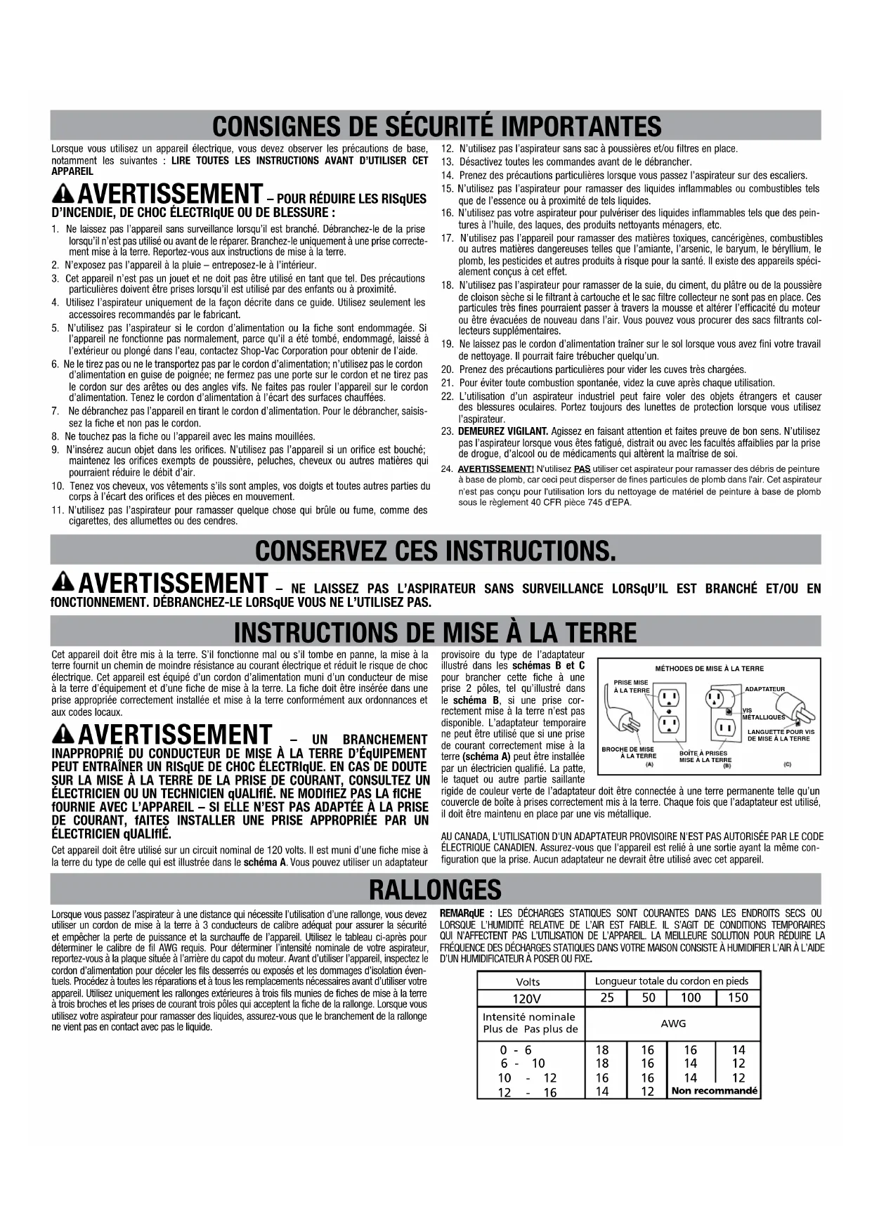 Lorsque vous passez l’aspirateur à une distance qui nécessite l’utilisation d’une rallonge, vous devez utiliser un cordon de mise à la terre à 3 conducteurs de calibre adéquat pour assurer la sécurité et empêcher la perte de puissance et la surchauffe de l’appareil. Utilisez le tableau ci-après pour déterminer le calibre de fil AWG requis. Pour déterminer l’intensité nominale de votre aspirateur, reportez-vous à la plaque située à l’arrière du capot du moteur. Avant d’utiliser l’appareil, inspectez le cordon d’alimentation pour déceler les fils desserrés ou exposés et les dommages d’isolation éven- tuels. Procédez à toutes les réparations et à tous les remplacements nécessaires avant d’utiliser votre appareil. Utilisez uniquement les rallonges extérieures à trois fils munies de fiches de mise à la terre à trois broches et les prises de courant trois pôles qui acceptent la fiche de la rallonge. Lorsque vous utilisez votre aspirateur pour ramasser des liquides, assurez-vous que le branchement de la rallonge ne vient pas en contact avec pas le liquide. RALLONGES Lorsque vous utilisez un appareil électrique, vous devez observer les précautions de base, notamment les suivantes : LIRE TOUTES LES INSTRUCTIONS AVANT D’UTILISER CET APPAREIL AVERTISSEMENT – POUR RÉDUIRE LES RISqUES D’INCENDIE, DE CHOC ÉLECTRIqUE OU DE BLESSURE :