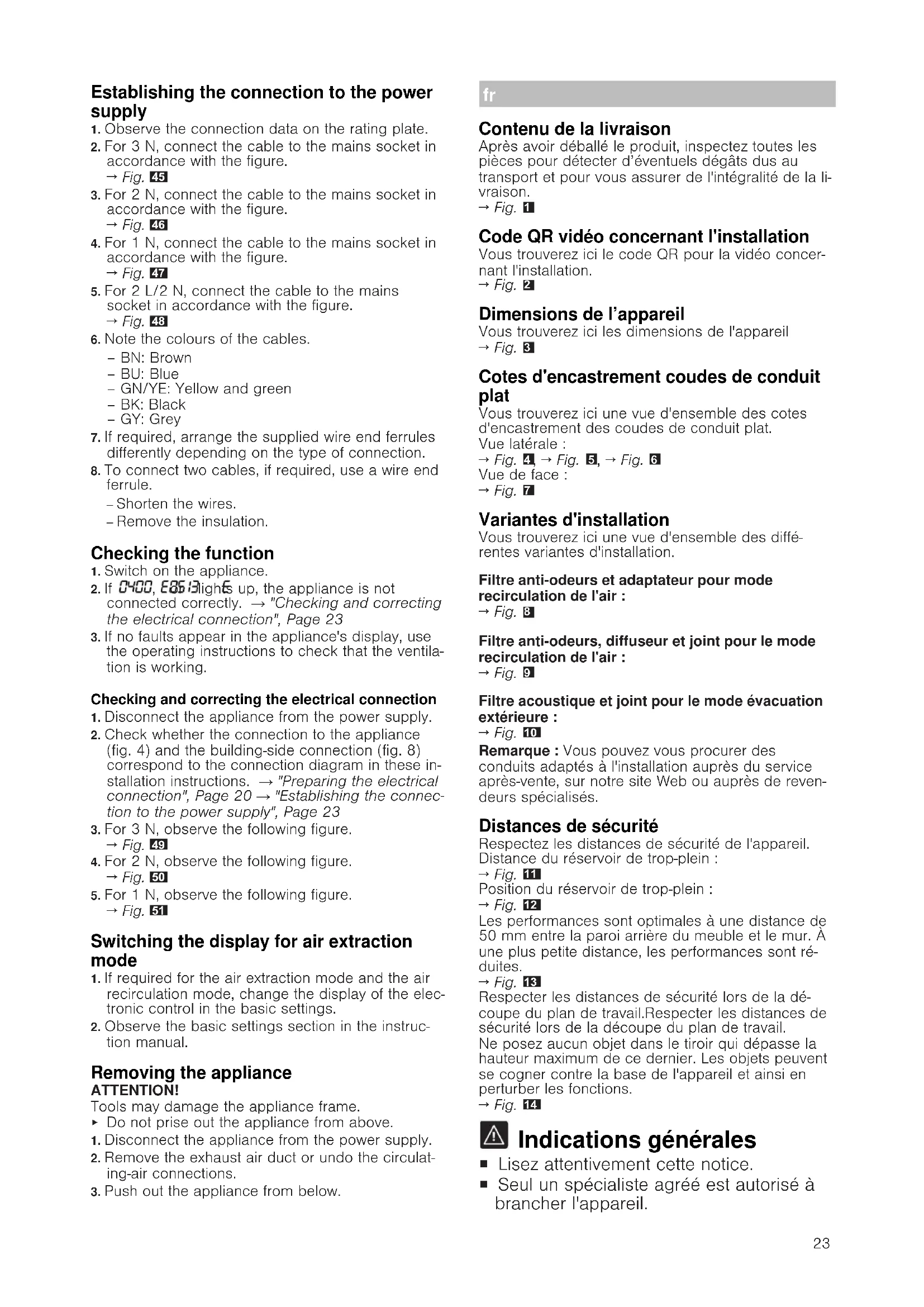 Indications générales ¡ Lisez attentivement cette notice. ¡ Seul un spécialiste agréé est autorisé à brancher l'appareil.24 ¡ Avant toute intervention sur l'appareil, coupez l'alimentation électrique. ¡ N'utilisez jamais cet appareil dans un ba- teau ou un véhicule. ¡ Respectez les recommandations du fabri- cant du plan de travail. Installation en toute sécurité Respectez les consignes de sécurité lorsque vous installez cet appareil. La sécurité d'utilisation est garantie uniquement en cas d'installation correcte et conforme aux instruc- tions de montage. Le monteur est responsable du fonctionnement correct sur le lieu où l'appareil est installé. AVERTISSEMENT‒Danger: magnétisme! L'appareil contient des aimants permanents. Ceux-ci peuvent influer sur des implants électroniques, par ex. des stimulateurs cardiaques ou des pompes à in- suline. ▶ Les personnes portant un implant électronique doivent donc respecter une distance minimum de 10cm avec l’appareil. AVERTISSEMENT‒Risque d'empoisonnement! Les gaz de combustion aspirés peuvent conduire à l'empoisonnement. Les foyers à combustion alimen- tés en air ambiant (par exemple appareils de chauf- fage au gaz, au fioul, au bois ou au charbon, les chauffe-eaux intégrés sous cuve, les chauffe-eaux accumulateurs) prélèvent l'air de combustion dans la pièce où ils sont installés et rejettent les gaz de fu- mée à l'extérieur par le biais d'un système spécifique (par ex., cheminée). Lorsque la hotte aspirante est en marche, elle prélève de l'air dans la cuisine et dans les pièces voisines. L'absence d'un apport d'air suffisant crée une pression négative. Les gaz toxiques provenant de la cheminée ou du conduit d'évacuation sont réaspirés dans les pièces d'habita- tion. ▶ En cas d'utilisation simultanée de l'appareil en mode évacuation extérieure et d'un foyer à com- bustion alimenté en air ambiant, veillez impérative- ment à ce que l'apport d'air soit toujours suffisant. ▶ Le fonctionnement sûr de l'appareil n'est possible que si la dépression dans la pièce où est installé le foyer ne dépasse pas 4Pa (0,04mbar). Cette valeur n'est réalisable que si l'apport d'air frais né- cessaire à la combustion est assuré par des ou- vertures non obturables, par exemple dans des portes ou fenêtres, associées à un caisson mural d'entrée et de sortie d'air, ou bien par d'autres moyens techniques. Un caisson mural d'entrée et de sortie d'air ne suffit pas à assurer la valeur mi- nimale nécessaire. ▶ Demandez toujours conseil à un maître ramoneur compétent qui pourra évaluer l'ensemble du ré- seau de ventilation de la maison et vous proposer le moyen le mieux adapté pour l'aération. ▶ Si l'appareil est utilisé exclusivement en mode re- circulation de l'air, le fonctionnement est possible sans restriction. AVERTISSEMENT‒Risque d'incendie! Les dépôts de graisse dans le filtre à graisse peuvent s'enflammer. ▶ Ne travaillez jamais avec une flamme nue à proxi- mité de l'appareil (par ex. ne faites rien flamber). ▶ Installez l’appareil à proximité d’un foyer à com- bustibles solides (par ex. bois ou charbon) uni- quement en présence d’un capot fermé et non amovible. Il ne doit pas y avoir de projection d’étincelles. AVERTISSEMENT‒Risque de blessure! Des modifications sur la construction électrique ou mécanique sont dangereuses et peuvent conduire à des dysfonctionnements. ▶ N'effectuez aucune modification sur la construc- tion électrique ou mécanique. Les pièces accessibles lors de l'installation peuvent présenter des arêtes vives et provoquer des cou- pures. ▶ Portez des gants de protection. L'appareil est lourd. ▶ 2personnes sont nécessaires pour déplacer l'ap- pareil. ▶ Utilisez exclusivement des moyens appropriés. AVERTISSEMENT‒Risque d'asphyxie! Les enfants risquent de s’envelopper dans les maté- riaux d’emballage ou de les mettre sur la tête et de s’étouffer. ▶ Conserver les matériaux d’emballage hors de por- tée des enfants. ▶ Ne jamais laisser les enfants jouer avec les em- ballages. AVERTISSEMENT‒Risque d'empoisonnement! Les gaz de combustion réaspirés peuvent provoquer un empoisonnement. ▶ Ne rejetez pas l'air sortant dans un conduit ou une cheminée en fonctionnement. ▶ Ne rejetez pas l’air sortant dans une gaine servant à aérer des locaux où sont installés des foyers à combustion. ▶ Si l’air sortant circule par un conduit ou une che- minée d'évacuation des gaz, vous devez d'abord obtenir l’accord d'un ramoneur compétent. Les gaz de combustion aspirés peuvent conduire à l'empoisonnement. ▶ Lorsqu'une hotte est installée avec un foyer exploi- tant l'air ambiant, l'alimentation électrique de la hotte doit être munie d'un interrupteur de sécurité approprié. Remarques concernant le branchement électrique Respectez ces consignes pour pouvoir effectuer le branchement électrique de l'appareil en toute sécuri- té. AVERTISSEMENT‒Risque d'électrocution! Il doit être à tout moment possible de débrancher l'appareil du réseau électrique. L'appareil doit impé- rativement être raccordé à une boîte de jonction ins- tallée de manière réglementaire. ▶ Dans l'installation électrique fixe, un dispositif de coupure omnipolaire doit être installé conformé- ment aux conditions de la catégorie de surtension III et aux réglementations d'installation. ▶ Seul un électricien qualifié est autorisé à procéder à l'installation électrique fixe. Nous vous recom- mandons d'installer un disjoncteur différentiel (in- terrupteur FI) dans le circuit d'alimentation de l'ap- pareil. ¡ Ne pas plier ou coincer le câble de raccordement et l'éloigner d'arêtes coupantes.25 ¡ Poser le câble de raccordement de sorte qu'il ne touche pas la coque chaude. ¡ Utiliser uniquement le câble de raccordement fourni avec l'appareil ou celui fourni par le Service après-vente tec