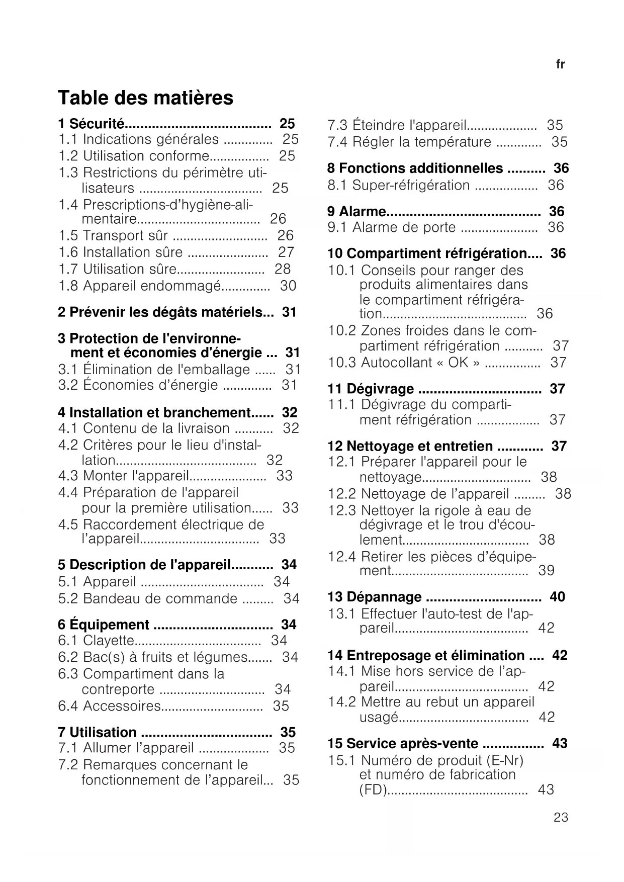 l'espace intérieur, laissez l'appareil ouvert. 14.2 Mettre au rebut un appa- reil usagé La destruction dans le respect de l’environnement permet de récupérer de précieuses matières premières. AVERTISSEMENT Risque de préjudice pour la santé! Des enfants risquent de s’enfermer dans l’appareil et de mettre leur vie en danger. ▶ Pour compliquer la pénétration des enfants dans l’appareil, ne pas reti- rer les clayettes et les bacs. ▶ Éloigner les enfants de l’appareil qui a cessé de servir.Service après-vente fr