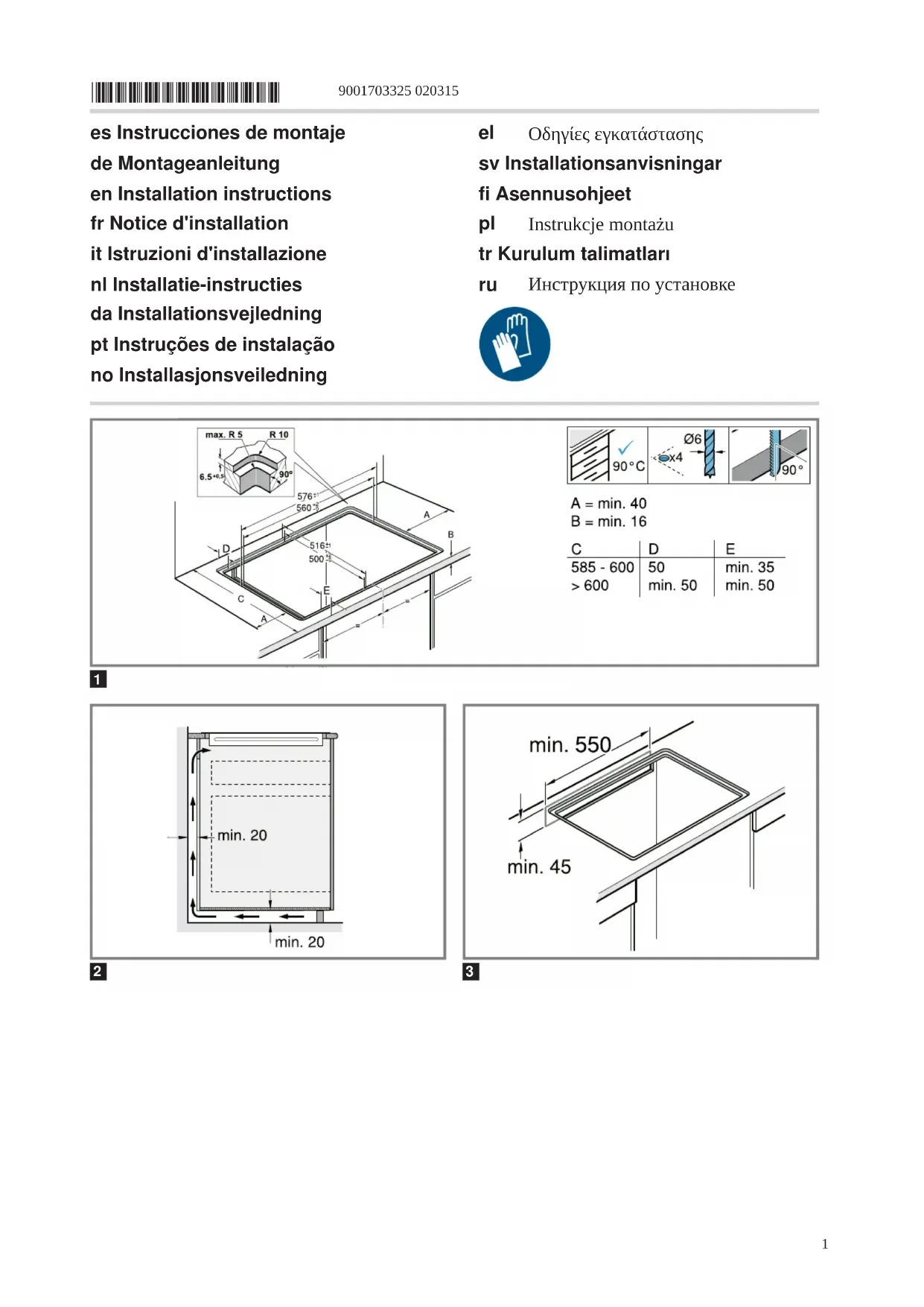 Indications générales ¡ Lisez attentivement cette notice. ¡ Seul un spécialiste agréé est autorisé à brancher l'appareil. ¡ Une installation, une ouverture de l'appa- reil, un raccordement ou un montage in- corrects annulent la validité de la garantie du produit. ¡ Avant toute intervention sur l'appareil, coupez l'alimentation électrique. ¡ Après l'installation, s'assurer que l'utilisa- teur n'a aucun accès aux pièces élec- triques. ¡ N'utilisez jamais cet appareil dans un ba- teau ou un véhicule. Installation en toute sécurité Respectez les consignes de sécurité lorsque vous installez cet appareil. La sécurité de l’appareil à l’usage est ga- rantie s’il a été incorporé conformément aux instructions de montage. Le monteur est responsable du fonctionnement correct sur le lieu où l'appareil est installé. AVERTISSEMENT‒Danger: magnétisme! L'appareil contient des aimants permanents. Ceux-ci peuvent influer sur des implants électroniques, par ex. des stimulateurs car- diaques ou des pompes à insuline. ▶ Les personnes portant un implant électro- nique doivent donc respecter une dis- tance minimum de 10cm avec l’appareil. AVERTISSEMENT‒Risque de blessure! Les pièces accessibles lors de l'installation peuvent présenter des arêtes vives et pro- voquer des coupures. ▶ Portez des gants de protection Conseils concernant le branchement électrique Respectez les conseils suivant pour pouvoir effec- tuer le branchement électrique de l'appareil en toute sécurité. ¡ Seul un spécialiste agréé ou un technicien de ser- vice spécialement formé est habilité à raccorder l'appareil. La personne doit être agréée conformé- ment aux réglementations locales du pays et de la compagnie d'électricité. ¡ Raccorder l'appareil à une installation fixe et des sectionneurs correspondants doivent être installés conformément aux prescriptions d'installation. ¡ Le fabricant décline toute responsabilité pour des dérangements ou dommages éventuels dus à une installation électrique incorrecte.12 Type de connexion ¡ Cet appareil est conforme à la classe de protec- tion 1. Par conséquent, utiliser l'appareil unique- ment avec une prise à conducteur de protection. Cordon d'alimentation Le cordon d'alimentation peut être raccordé à la prise de raccordement de la table de cuisson ou être joint à l'appareil. ¡ Vous trouverez les valeurs de raccordement re- quises sur la plaque signalétique et sur le schéma de raccordement. ¡ Utiliser uniquement le câble de raccordement fourni avec l'appareil ou fourni par le service après-vente. Si vous avez besoin d'un câble plus long, contactez le service après-vente. Des cor- dons d'alimentation secteur jusqu'à 2,20 m de lon- gueur sont disponibles. Conseils concernant les meubles d'encastrement ¡ Vous pouvez installer la table à induction unique- ment via des tiroirs ou des fours à ventilation for- cée. Ne pas installer de réfrigérateur, de lave-vais- selle, de four non ventilé ou de lave-linge sous la table de cuisson. ¡ S'assurer que les meubles d'encastrement ré- sistent à la chaleur jusqu'au moins 90°C. Plan de travail Respecter les recommandations du fabricant du plan de travail. ¡ À plat, à l'horizontale, stable. ¡ Le plan de travail dans lequel vous intégrez l'ap- pareil doit pouvoir supporter une charge d'environ 60kg. ¡ Pour des plans de travail minces, utiliser un maté- riau de renforcement résistant à la chaleur et á l'humidité. ¡ Vérifier la planéité de la table de cuisson une fois qu'elle est montée. ¡ Vous pouvez intégrer l'appareil dans les plans de travail résistants aux températures élevées et étanches suivants : – Plans de travail en marbre, pierre naturelle. – Plans de travail en matière plastique. – Plans de travail en bois massif, uniquement avec l'accord du fabricant du plan de travail, sceller les bords de coupe. – D'autres plans de travail, uniquement avec l'ac- cord du fabricant du plan de travail. ¡ Pour aligner l'appareil, ne pas utiliser de supports à des points individuels. ¡ Les travaux de découpe sur le plan de travail doivent être effectués par une entreprise spéciali- sée conformément au croquis de montage. L'arête de coupe doit être propre et précise car le bord est visible sur la surface. Nettoyer et dégraisse´r les arêtes de coupe à l'aide d'un détergent adap- té. Hotte ¡ La distance entre la hotte et la table de cuisson doit être au moins égale à la distance indiquée dans les instructions de montage de la hotte. Préparation des meubles d'encastrement