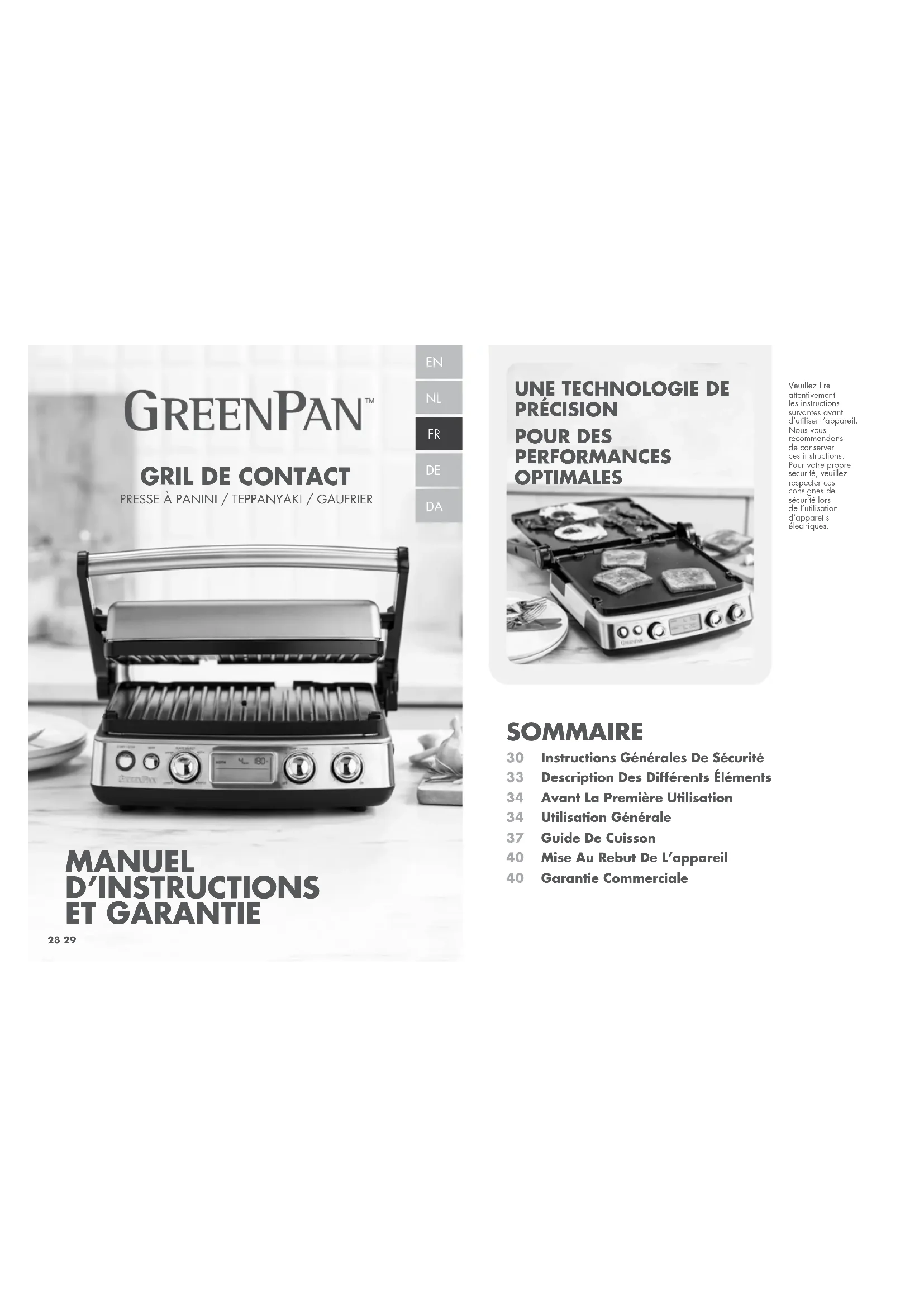 MANUEL D’INSTRUCTIONS ET GARANTIE SOMMAIRE Instructions Générales De SécuritéDescription Des Différents ÉlémentsAvant La Première UtilisationUtilisation GénéraleGuide De CuissonMise Au Rebut De L’appareilGarantie Commerciale