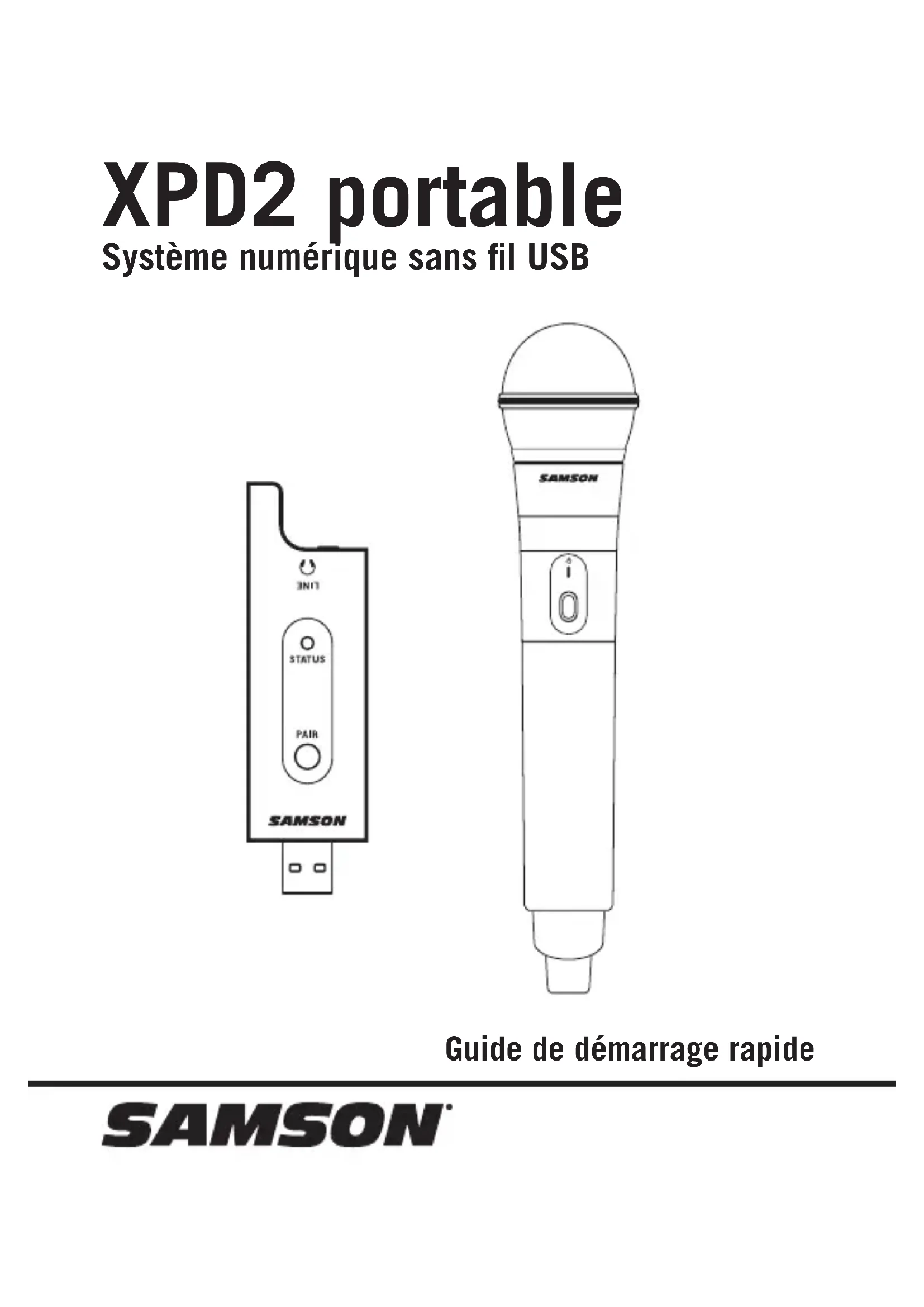 normal et augmentez la commande de niveau d'entrée sur le canal correspondant jusqu'à ce que le niveau souhaité soit atteint.10 Le récepteur RXD2 peut être utilisé avec un smartphone pour ajouter un microphone sans fil à vos streaming live ou pour la réalisation de films sur mobile. Pour utiliser le système XDP2 avec un iPhone ou un iPad, vous devrez utiliser l'adaptateur pour appareil photo Lightning to USB d'Apple (non fourni). Pour utiliser le système XPD2 avec un appareil Android, vous devrez utiliser un adaptateur OTG Host. Vous pouvez connecter un casque à la sortie casque 3,5 mm (1/8") pour vérifier le signal sans fil. Connexion à un smartphoneSystème numérique sans fil XPD2 USB 11 Systèmes simultanés 2 Portée de travail 100' ligne de visée Fréquence de travail 2.404~2.476GHZ Type de modulation GFSK Réponse en fréquence audio 20HZ - 16KHZ T.H.D <0.1% (à 1KHz, -10dBu) Rapport signal/bruit >85 dB Température de fonctionnement -10°C ~ +40°C Transmetteur HXD1 Microphone Element Q6 Dynamic Puissance RF <10 mW EIRP Alimentation électrique requise Deux piles alcalines AA (LR6) Autonomie de la batterie 20 heures Dimensions 10.2” x ø2.1” 260 mm x ø54 mm Poids 0.5 lb / 218 g Récepteur RXD2 Niveau de sortie audio analogique max. 0 dBu Impédance de sortie audio 100 kΩ Taux d'échantillonnage audio USB 32 KHZ Tension de fonctionnement 5V DC Dimensions (LxLxP) 3.5” x 0.9” x .31” 89mm x 23mm x 8mm Poids 0.35oz / 10g Caractéristiques techniques Chez Samson, nous améliorons continuellement nos produits, c’est pourquoi les caractéristiques techniques et les images sont sujettes à changement sans préavis.Samson Technologies Corp. Copyright 2017, Samson Technologies Corp. v3 278-B Duffy Ave Hicksville, New York 11801 Téléphone : 1-800-3-SAMSON (1-800-372-6766) www.samsontech.com Suivez-nous: Vous avez des problèmes avec votre système sans fil XPD2? Nous pouvons vous aider! CONTACTEZ NOTRE ÉQUIPE DE MAINTENANCE: support@samsontech.com Nos experts sont là pour vous aider. @samson @samsontech @samson_technologies