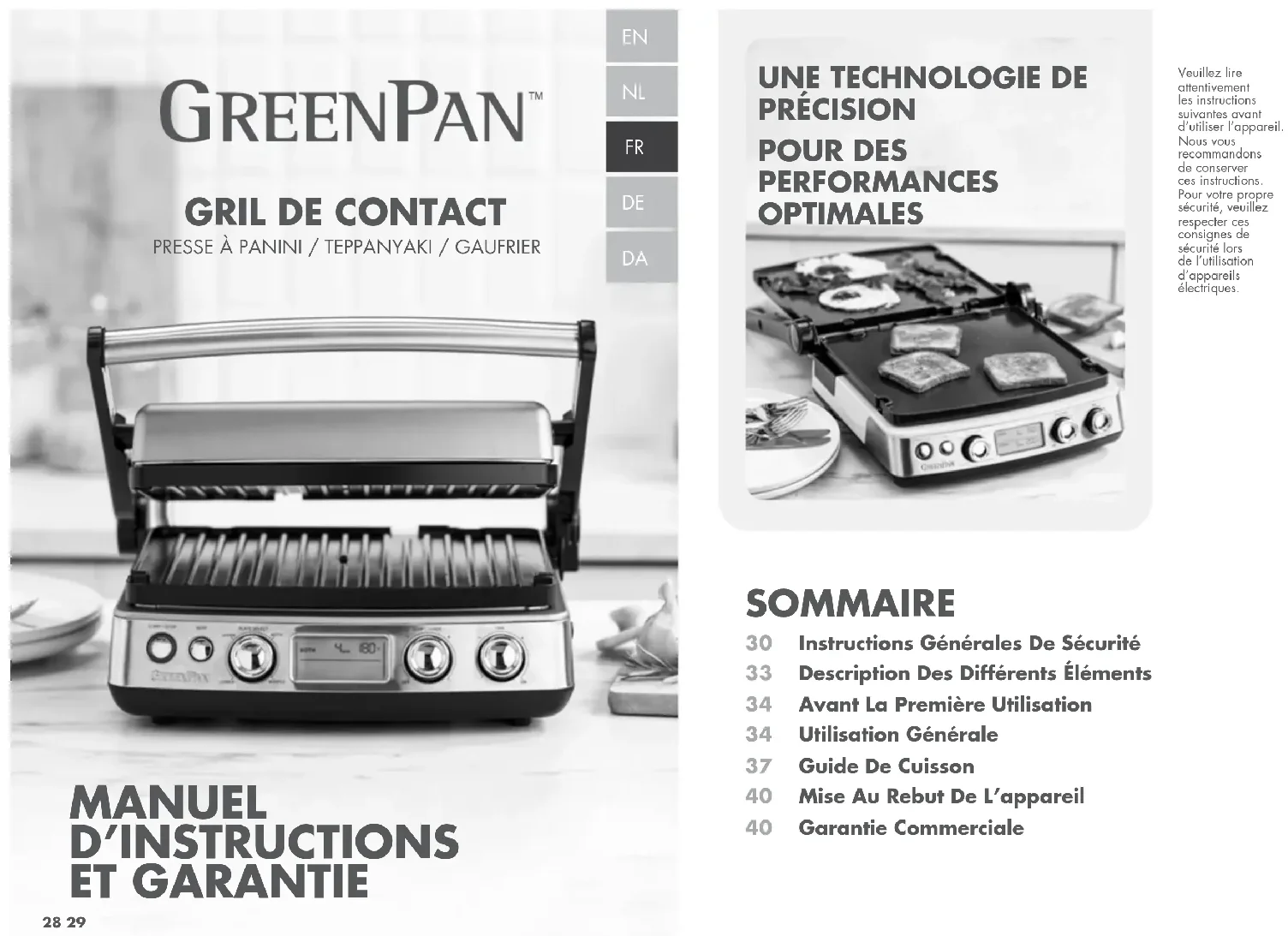 MANUEL D’INSTRUCTIONS ET GARANTIE SOMMAIRE Instructions Générales De SécuritéDescription Des Différents ÉlémentsAvant La Première UtilisationUtilisation GénéraleGuide De CuissonMise Au Rebut De L’appareilGarantie Commerciale