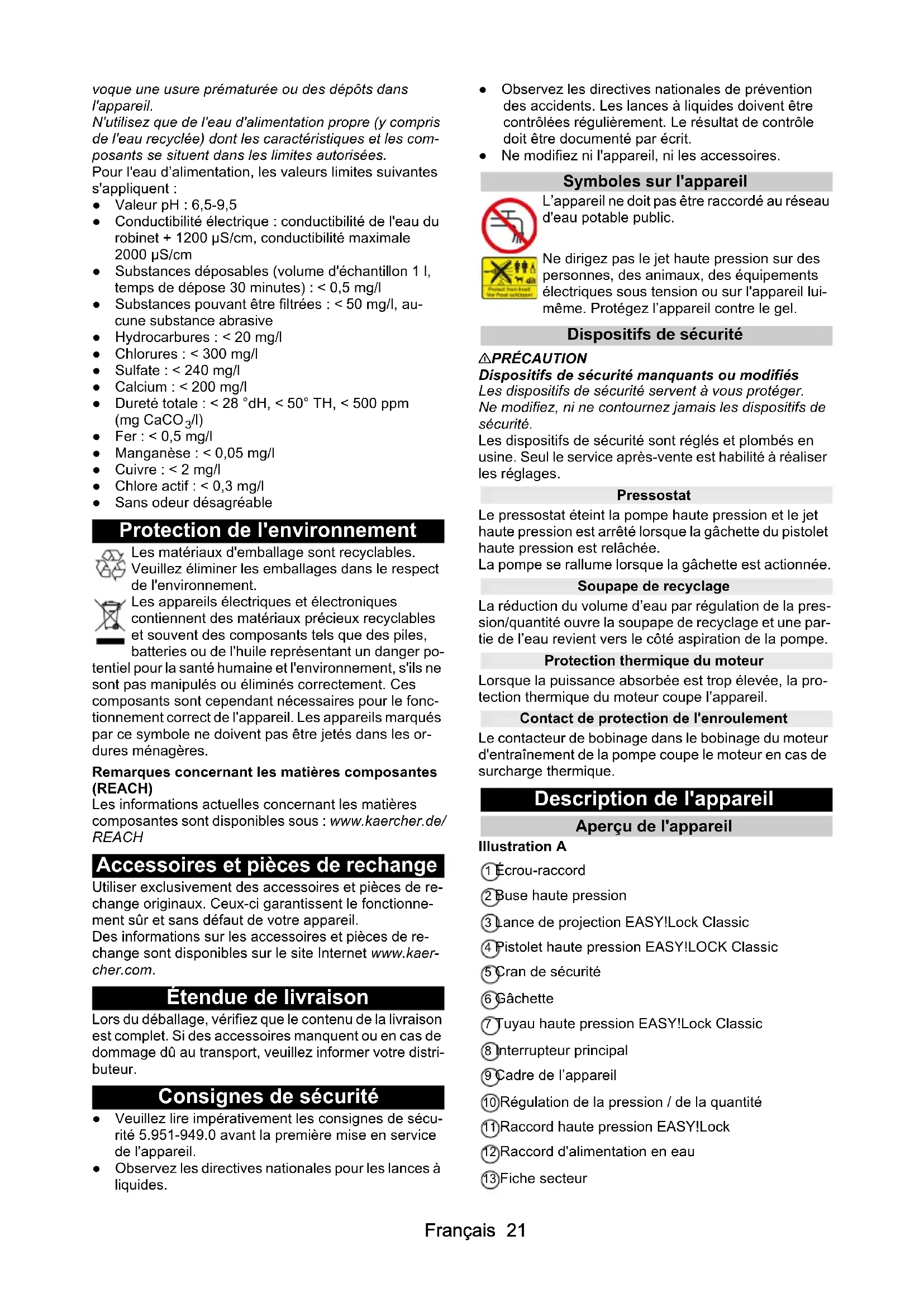 /l) ● Fer : < 0,5 mg/l ● Manganèse : < 0,05 mg/l ● Cuivre : < 2 mg/l ● Chlore actif : < 0,3 mg/l ● Sans odeur désagréable Protection de l'environnement Les matériaux d'emballage sont recyclables. Veuillez éliminer les emballages dans le respect de l'environnement. Les appareils électriques et électroniques contiennent des matériaux précieux recyclables et souvent des composants tels que des piles, batteries ou de l'huile représentant un danger po- tentiel pour la santé humaine et l'environnement, s'ils ne sont pas manipulés ou éliminés correctement. Ces composants sont cependant nécessaires pour le fonc- tionnement correct de l'appareil. Les appareils marqués par ce symbole ne doivent pas être jetés dans les or- dures ménagères. Remarques concernant les matières composantes (REACH) Les informations actuelles concernant les matières composantes sont disponibles sous : www.kaercher.de/ REACH Accessoires et pièces de rechange Utiliser exclusivement des accessoires et pièces de re- change originaux. Ceux-ci garantissent le fonctionne- ment sûr et sans défaut de votre appareil. Des informations sur les accessoires et pièces de re- change sont disponibles sur le site Internet www.kaer- cher.com. Étendue de livraison Lors du déballage, vérifiez que le contenu de la livraison est complet. Si des accessoires manquent ou en cas de dommage dû au transport, veuillez informer votre distri- buteur. Consignes de sécurité ● Veuillez lire impérativement les consignes de sécu- rité 5.951-949.0 avant la première mise en service de l'appareil. ● Observez les directives nationales pour les lances à liquides. ● Observez les directives nationales de prévention des accidents. Les lances à liquides doivent être contrôlées régulièrement. Le résultat de contrôle doit être documenté par écrit. ● Ne modifiez ni l'appareil, ni les accessoires. Symboles sur l'appareil L’appareil ne doit pas être raccordé au réseau d'eau potable public. Ne dirigez pas le jet haute pression sur des personnes, des animaux, des équipements électriques sous tension ou sur l'appareil lui- même. Protégez l’appareil contre le gel. Dispositifs de sécurité 몇 PRÉCAUTION Dispositifs de sécurité manquants ou modifiés Les dispositifs de sécurité servent à vous protéger. Ne modifiez, ni ne contournez jamais les dispositifs de sécurité. Les dispositifs de sécurité sont réglés et plombés en usine. Seul le service après-vente est habilité à réaliser les réglages. Pressostat Le pressostat éteint la pompe haute pression et le jet haute pression est arrêté lorsque la gâchette du pistolet haute pression est relâchée. La pompe se rallume lorsque la gâchette est actionnée. Soupape de recyclage La réduction du volume d’eau par régulation de la pres- sion/quantité ouvre la soupape de recyclage et une par- tie de l’eau revient vers le côté aspiration de la pompe. Protection thermique du moteur Lorsque la puissance absorbée est trop élevée, la pro- tection thermique du moteur coupe l’appareil. Contact de protection de l'enroulement Le contacteur de bobinage dans le bobinage du moteur d'entraînement de la pompe coupe le moteur en cas de surcharge thermique. Description de l'appareil Aperçu de l'appareil Illustration A 1 Écrou-raccord 2 Buse haute pression 3 Lance de projection EASY!Lock Classic 4 Pistolet haute pression EASY!LOCK Classic 5 Cran de sécurité 6 Gâchette 7 Tuyau haute pression EASY!Lock Classic 8 Interrupteur principal 9 Cadre de l’appareil 10 Régulation de la pression / de la quantité 11 Raccord haute pression EASY!Lock 12 Raccord d'alimentation en eau 13 Fiche secteur22 Français 14 Câble secteur 15 Pied (4 pièces) 16 Verre-regard 17 Vis de vidange d'huile 18 Œillet de suspension 19 Filtre fin 20 Bouchons 21 Compartiment accessoires 22 Plaque signalétique (pompe haute pression) 23 Jauge d'huile avec vanne de purge 24 Plaque signalétique (appareil) Code couleur ● Les éléments de commande pour le processus de nettoyage sont jaunes. ● Les éléments de commande pour la maintenance et le service sont gris clair. Montage Placer ou poser l'appareil L'appareil convient pour un montage mural ou comme appareil à poser. Montage mural DANGER Danger de mort et risque de blessures dus au rou- lement de l'appareil ! La chute de l'appareil présente un danger de mort et un risque d'endommagement. Ne montez l'appareil que sur des murs appropriés et so- lides. Teniez compte du poids de l’appareil pour le montage. Utilisez des moyens de levage appropriés ou faites ap- pel à des assistants. Utilisez des moyens de fixation appropriés et veillez à ce que le montage soit effectué dans les règles de l'art. En cas de doute, confiez le montage à une personne compétente. ATTENTION Risque d'endommagement par le gel ! Un appareil pas entièrement vidé peut être endommagé par le gel. Protéger l'appareil contre le gel. Utiliser ou stocker l'appareil dans un endroit à l'abri du gel. Vider complètement l'appareil et ses accessoires avant de les stocker.
