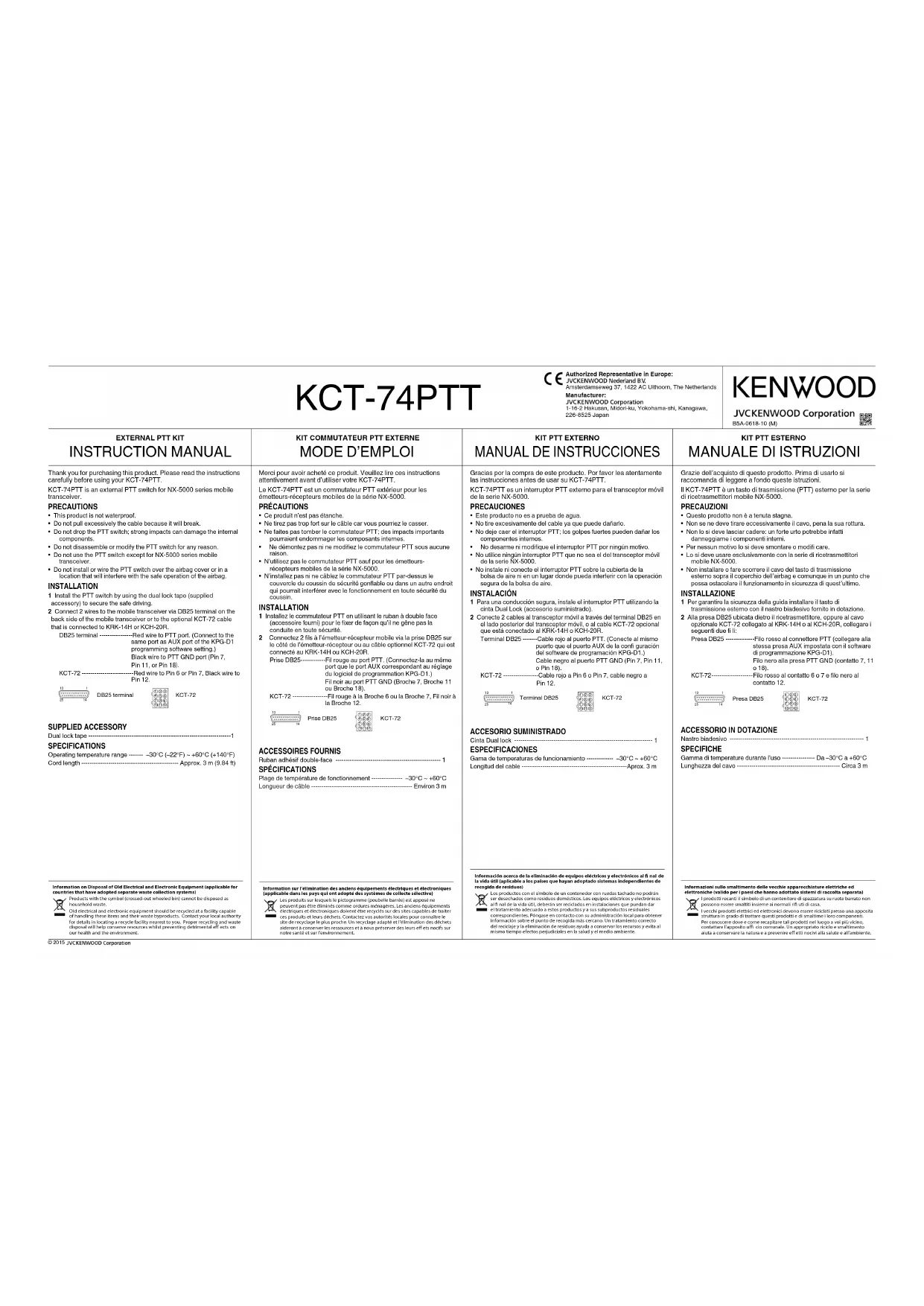 Information on Disposal of Old Electrical and Electronic Equipment (applicable for countries that have adopted separate waste collection systems)Products with the symbol (crossed-out wheeled bin) cannot be disposed as household waste.Old electrical and electronic equipment should be recycled at a facility capable of handling these items and their waste byproducts. Contact your local authority for details in locating a recycle facility nearest to you. Proper recycling and waste disposal will help conserve resources whilst preventing detrimental e ects on our health and the environment.Information sur l’élimination des anciens équipements électriques et électroniques (applicable dans les pays qui ont adopté des systèmes de collecte sélective)Les produits sur lesquels le pictogramme (poubelle barrée) est apposé ne peuvent pas être éliminés comme ordures ménagères. Les anciens équipements électriques et électroniques doivent être recyclés sur des sites capables de traiter ces produits et leurs déchets. Contactez vos autorités locales pour connaître le site de recyclage le plus proche. Un recyclage adapté et l’élimination des déchets aideront à conserver les ressources et à nous préserver des leurs e ets nocifs sur notre santé et sur l’environnement.Información acerca de la eliminación de equipos eléctricos y electrónicos al nal de la vida útil (aplicable a los países que hayan adoptado sistemas independientes de recogida de residuos)Los productos con el símbolo de un contenedor con ruedas tachado no podrán ser desechados como residuos domésticos. Los equipos eléctricos y electrónicos al nal de la vida útil, deberán ser reciclados en instalaciones que puedan dar el tratamiento adecuado a estos productos y a sus subproductos residuales correspondientes. Póngase en contacto con su administración local para obtener información sobre el punto de recogida más cercano. Un tratamiento correcto del reciclaje y la eliminación de residuos ayuda a conservar los recursos y evita al mismo tiempo efectos perjudiciales en la salud y el medio ambiente.Informazioni sullo smaltimento delle vecchie apparecchiature elettriche ed elettroniche (valido per i paesi che hanno adottato sistemi di raccolta separata) I prodotti recanti il simbolo di un contenitore di spazzatura su ruote barrato non possono essere smaltiti insieme ai normali ri uti di casa. I vecchi prodotti elettrici ed elettronici devono essere riciclati presso una apposita struttura in grado di trattare questi prodotti e di smaltirne i loro componenti. Per conoscere dove e come recapitare tali prodotti nel luogo a voi più vicino, contattare l’apposito u cio comunale. Un appropriato riciclo e smaltimento aiuta a conservare la natura e a prevenire e etti nocivi alla salute e all’ambiente. Authorized Representative in Europe:Amsterdamseweg 37, 1422 AC Uithoorn, The NetherlandsManufacturer:1-16-2 Hakusan, Midori-ku, Yokohama-shi, Kanagawa, 226-8525 Japan© 2015 Merci pour avoir acheté ce produit. Veuillez lire ces instructions attentivement avant d’utiliser votre KCT-74PTT. Le KCT-74PTT est un commutateur PTT extérieur pour les émetteurs-récepteurs mobiles de la série NX-5000. PRÉCAUTIONS