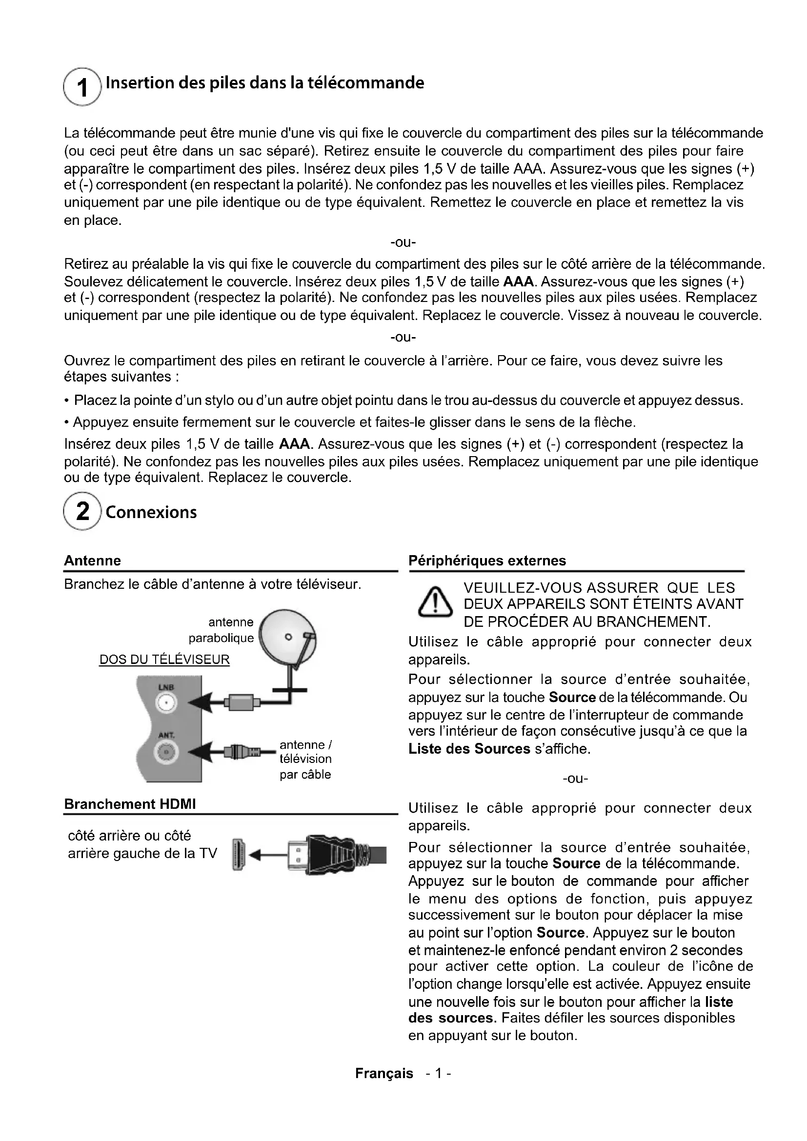 DE PROCÉDER AU BRANCHEMENT. Utilisez le câble approprié pour connecter deux appareils. Pour sélectionner la source d’entrée souhaitée, appuyez sur la touche Source de la télécommande. Ou appuyez sur le centre de l’interrupteur de commande vers l’intérieur de façon consécutive jusqu’à ce que la Liste des Sources s’ache. -ou- Utilisez le câble approprié pour connecter deux appareils. Pour sélectionner la source d’entrée souhaitée, appuyez sur la touche Source de la télécommande. Appuyez sur le bouton de commande pour acher le menu des options de fonction, puis appuyez successivement sur le bouton pour déplacer la mise au point sur l’option Source. Appuyez sur le bouton et maintenez-le enfoncé pendant environ 2 secondes pour activer cette option. La couleur de l’icône de l’option change lorsqu’elle est activée. Appuyez ensuite une nouvelle fois sur le bouton pour acher la liste des sources. Faites déler les sources disponibles en appuyant sur le bouton.Français - 2 - Alimentation Après le déballage, laissez le téléviseur atteindre la température ambiante de la pièce avant de le brancher sur la prise secteur. Branchez le câble d’alimentation à la prise secteur. IMPORTANT: Le téléviseur a été conçu pour fonctionner avec une alimentation électrique