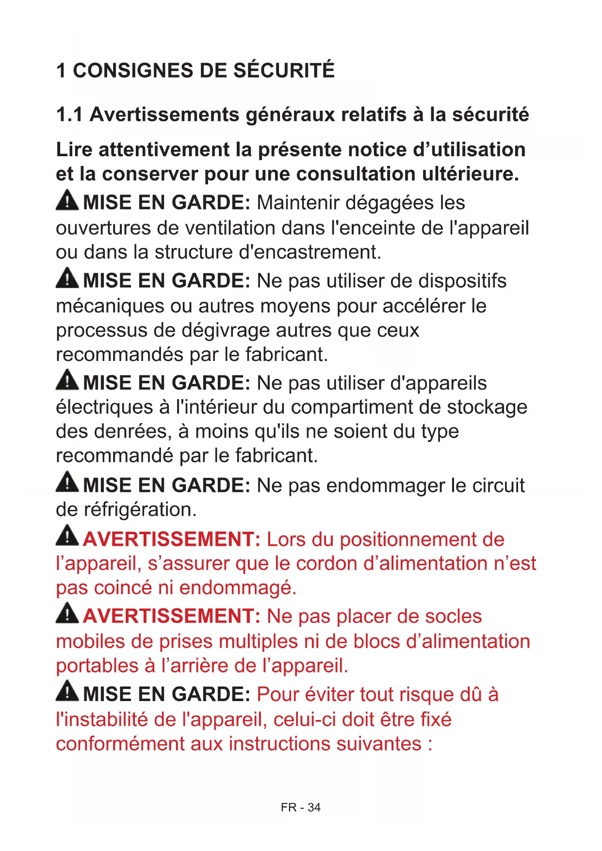 Lire attentivement la présente notice d’utilisation et la conserver pour une consultation ultérieure. MISE EN GARDE: Maintenir dégagées les ouvertures de ventilation dans l'enceinte de l'appareil ou dans la structure d'encastrement. MISE EN GARDE: Ne pas utiliser de dispositifs mécaniques ou autres moyens pour accélérer le processus de dégivrage autres que ceux recommandés par le fabricant. MISE EN GARDE: Ne pas utiliser d'appareils électriques à l'intérieur du compartiment de stockage des denrées, à moins qu'ils ne soient du type recommandé par le fabricant. MISE EN GARDE: Ne pas endommager le circuit de réfrigération.