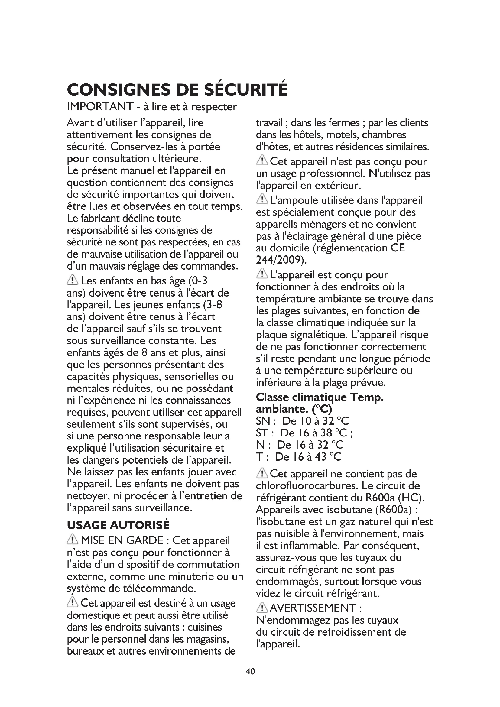 IMPORTANT - à lire et à respecter Avant d’utiliser l’appareil, lire attentivement les consignes de sécurité. Conservez-les à portée pour consultation ultérieure. Le présent manuel et l'appareil en question contiennent des consignes de sécurité importantes qui doivent être lues et observées en tout temps. Le fabricant décline toute responsabilité si les consignes de sécurité ne sont pas respectées, en cas de mauvaise utilisation de l’appareil ou d’un mauvais réglage des commandes. Les enfants en bas âge (0-3 ans) doivent être tenus à l'écart de l'appareil. Les jeunes enfants (3-8 ans) doivent être tenus à l’écart de l’appareil sauf s’ils se trouvent sous surveillance constante. Les enfants âgés de 8 ans et plus, ainsi que les personnes présentant des capacités physiques, sensorielles ou mentales réduites, ou ne possédant ni l’expérience ni les connaissances requises, peuvent utiliser cet appareil seulement s’ils sont supervisés, ou si une personne responsable leur a expliqué l’utilisation sécuritaire et les dangers potentiels de l’appareil. Ne laissez pas les enfants jouer avec l’appareil. Les enfants ne doivent pas nettoyer, ni procéder à l’entretien de l’appareil sans surveillance. USAGE AUTORISÉ MISE EN GARDE : Cet appareil n’est pas conçu pour fonctionner à l’aide d’un dispositif de commutation externe, comme une minuterie ou un système de télécommande. Cet appareil est destiné à un usage domestique et peut aussi être utilisé dans les endroits suivants : cuisines pour le personnel dans les magasins, bureaux et autres environnements de travail ; dans les fermes ; par les clients dans les hôtels, motels, chambres d'hôtes, et autres résidences similaires. Cet appareil n'est pas conçu pour un usage professionnel. N'utilisez pas l'appareil en extérieur. L'ampoule utilisée dans l'appareil est spécialement conçue pour des appareils ménagers et ne convient pas à l'éclairage général d'une pièce au domicile (réglementation CE 244/2009). L'appareil est conçu pour fonctionner à des endroits où la température ambiante se trouve dans les plages suivantes, en fonction de la classe climatique indiquée sur la plaque signalétique. L’appareil risque de ne pas fonctionner correctement s’il reste pendant une longue période à une température supérieure ou inférieure à la plage prévue. Classe climatique Temp. ambiante. (°C) SN : De 10 à 32 °C ST : De 16 à 38 °C ; N : De 16 à 32 °C T : De 16 à 43 °C Cet appareil ne contient pas de chlorofluorocarbures. Le circuit de réfrigérant contient du R600a (HC). Appareils avec isobutane (R600a) : l'isobutane est un gaz naturel qui n'est pas nuisible à l'environnement, mais il est inflammable. Par conséquent, assurez-vous que les tuyaux du circuit réfrigérant ne sont pas endommagés, surtout lorsque vous videz le circuit réfrigérant.