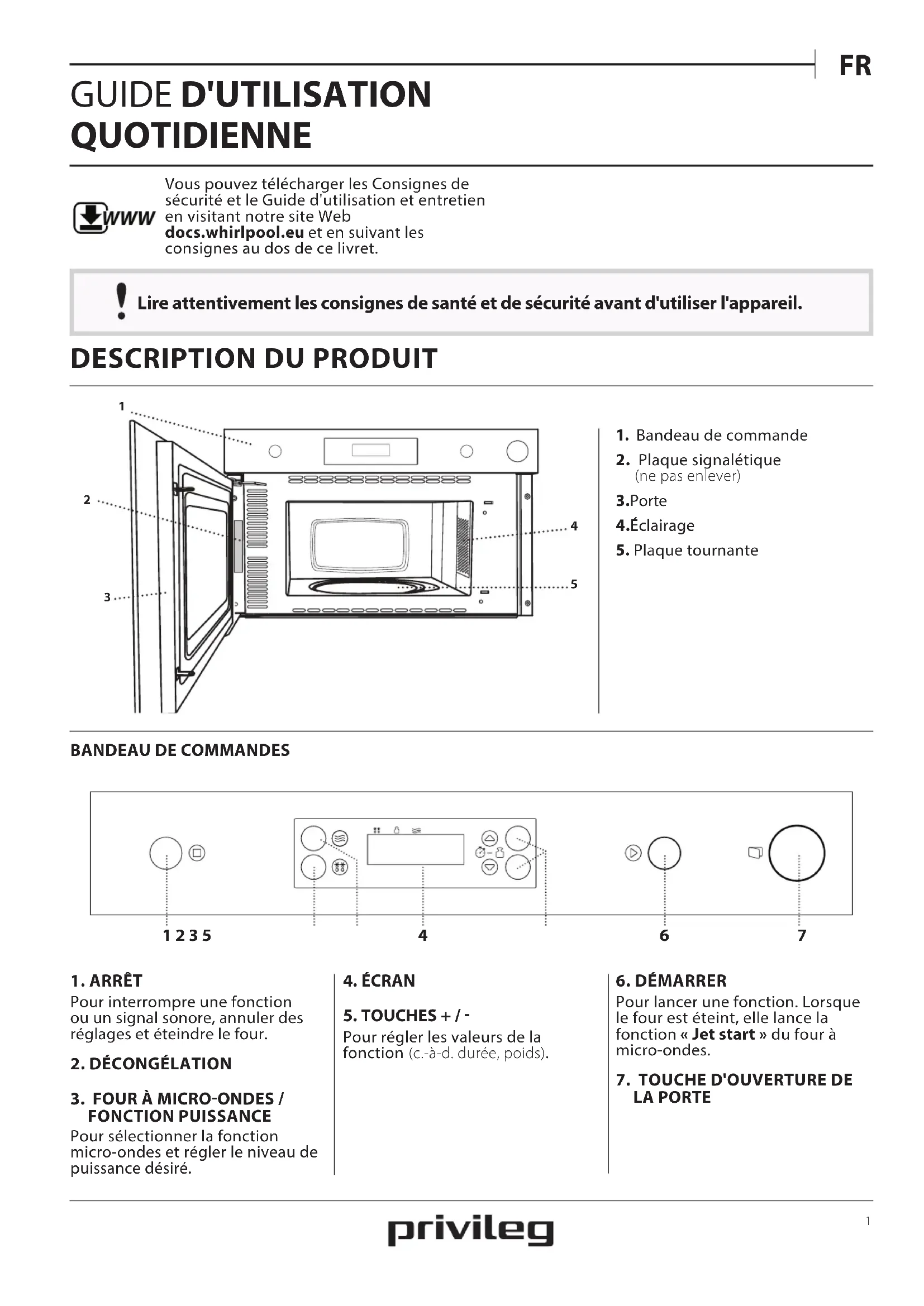 LA PORTE WWW Vous pouvez télécharger les Consignes de sécurité et le Guide d'utilisation et entretien en visitant notre site Web docs.whirlpool.eu et en suivant les consignes au dos de ce livret.