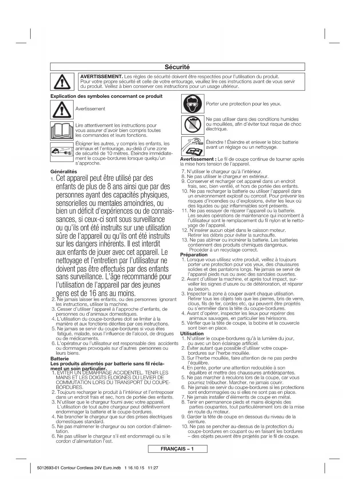 coupe-bordures en coupant ou en faisant les bordures – des objets peuvent être projetés par le fil de coupe. 5012693-01 Contour Cordless 24V Euro.indb 1 16.10.15 11:27FRANÇAIS – 2