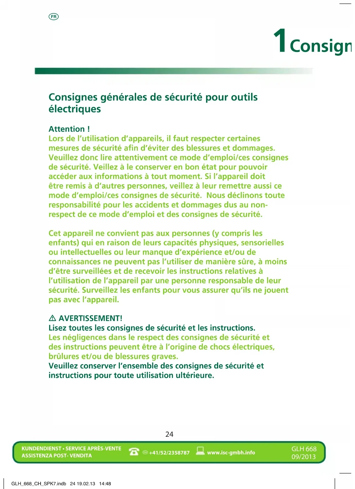 KUNDENDIENST • SERVICE APRÈS-VENTE ASSISTENZA POST- VENDITA +41/52/2358787www.isc-gmbh.info GLH 668 09/2013 Consignes générales de sécurité pour outils électriques Attention ! Lors de l’utilisation d’appareils, il faut respecter certaines mesures de sécurité afin d’éviter des blessures et dommages. Veuillez donc lire attentivement ce mode d’emploi/ces consignes de sécurité. Veillez à le conserver en bon état pour pouvoir accéder aux informations à tout moment. Si l’appareil doit être remis à d’autres personnes, veillez à leur remettre aussi ce mode d’emploi/ces consignes de sécurité. Nous déclinons toute responsabilité pour les accidents et dommages dus au non- respect de ce mode d’emploi et des consignes de sécurité. Cet appareil ne convient pas aux personnes (y compris les enfants) qui en raison de leurs capacités physiques, sensorielles ou intellectuelles ou leur manque d’expérience et/ou de connaissances ne peuvent pas l’utiliser de manière sûre, à moins d’être surveillées et de recevoir les instructions relatives à l’utilisation de l’appareil par une personne responsable de leur sécurité. Surveillez les enfants pour vous assurer qu’ils ne jouent pas avec l’appareil. m AVERTISSEMENT! Lisez toutes les consignes de sécurité et les instructions. Les négligences dans le respect des consignes de sécurité et des instructions peuvent être à l’origine de chocs électriques, brûlures et/ou de blessures graves. Veuillez conserver l’ensemble des consignes de sécurité et instructions pour toute utilisation ultérieure. 1Consignes de sécurité GLH_668_CH_SPK7.indb 24 19.02.13 14:48s