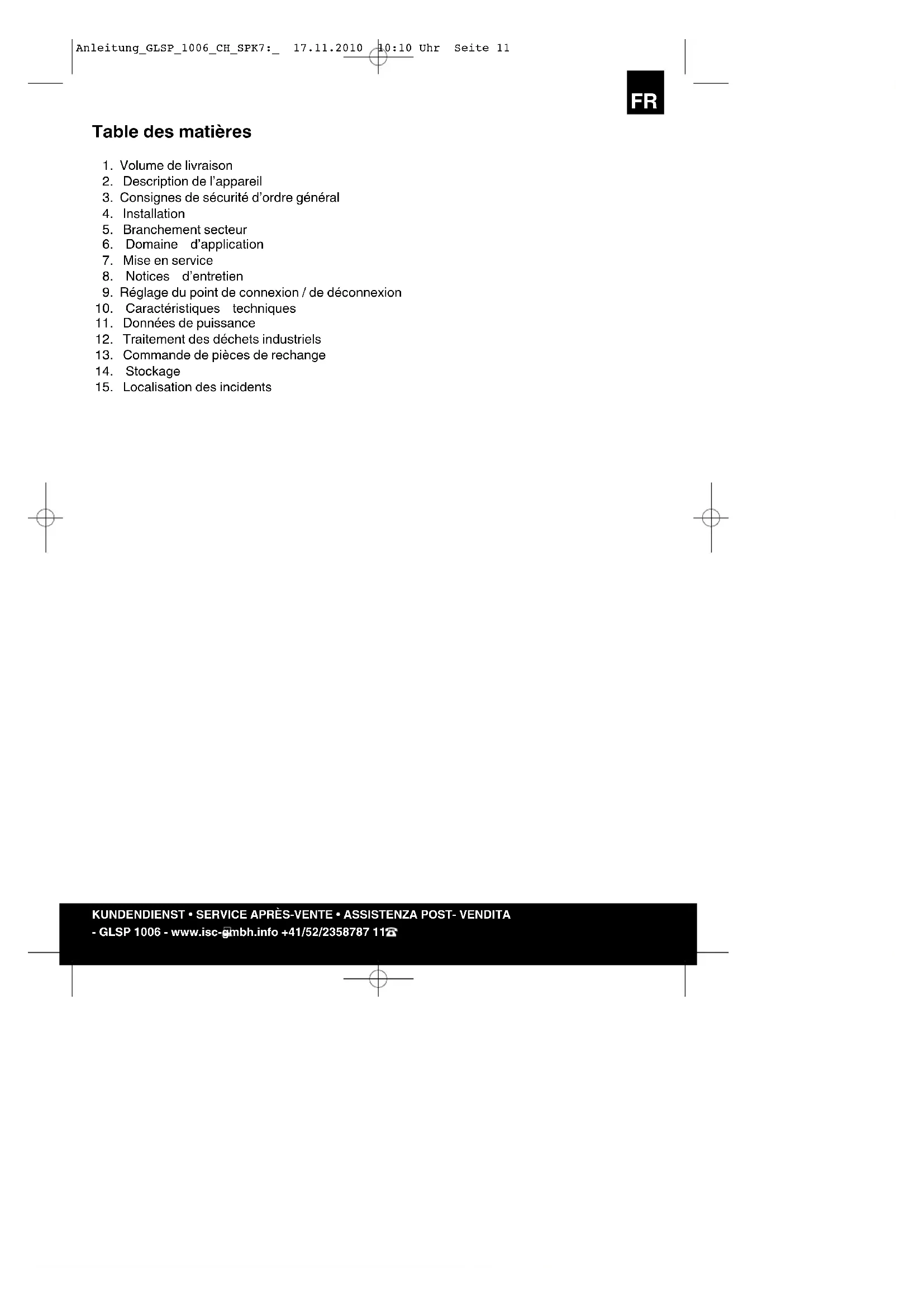 KUNDENDIENST • SERVICE APRÈS-VENTE • ASSISTENZA POST- VENDITA - GLSP 1006 - www.isc-gmbh.info +41/52/2358787 11 Anleitung_GLSP_1006_CH_SPK7:_ 17.11.2010 10:10 Uhr Seite 111. Volume de livraison Ouvrez l’emballage et prenez l’appareil en le sortant avec précaution de l’emballage. Retirez le matériel d’emballage tout comme les sécurités d’emballage et de transport (s’il y en a). Vérifiez si la livraison est bien complète. Contrôlez si l’appareil et ses accessoires ne sont pas endommagés par le transport. Conservez l’emballage autant que possible jusqu’à la fin de la période de garantie. ATTENTION L’appareil et le matériel d’emballage ne sont pas des jouets ! Il est interdit de laisser des enfants jouer avec des sacs et des films en plastique et avec des pièces de petite taille. Ils risquent de les avaler et de s’étouffer !