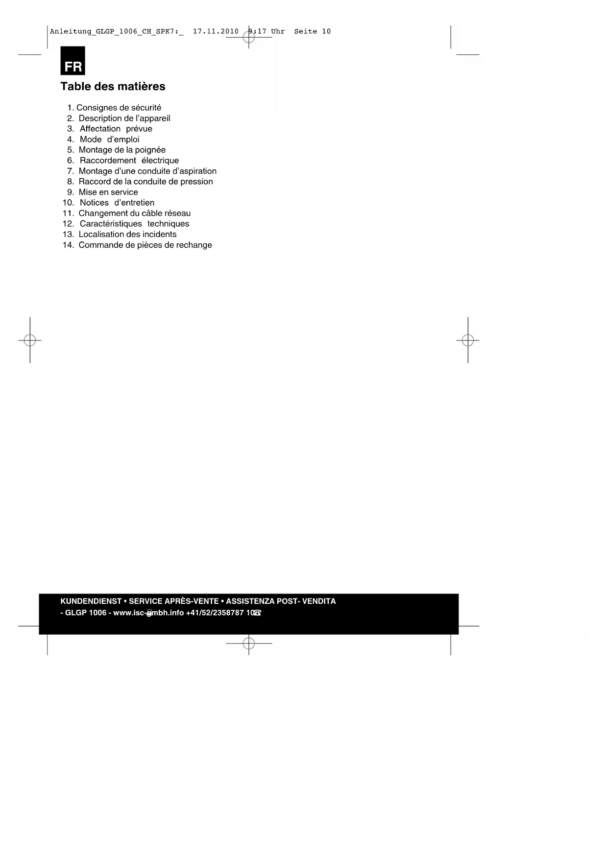 Anleitung_GLGP_1006_CH_SPK7:_ 17.11.2010 9:17 Uhr Seite 1514. Commande de pièces de rechange Pour les commandes de pièces de rechange, veuillez indiquer les références suivantes: Type de lʼappareil No. dʼarticle de lʼappareil No. dʼidentification de lʼappareil No. de pièce de rechange de la pièce requise Vous trouverez les prix et informations actuelles à lʼadresse www.isc-gmbh.info