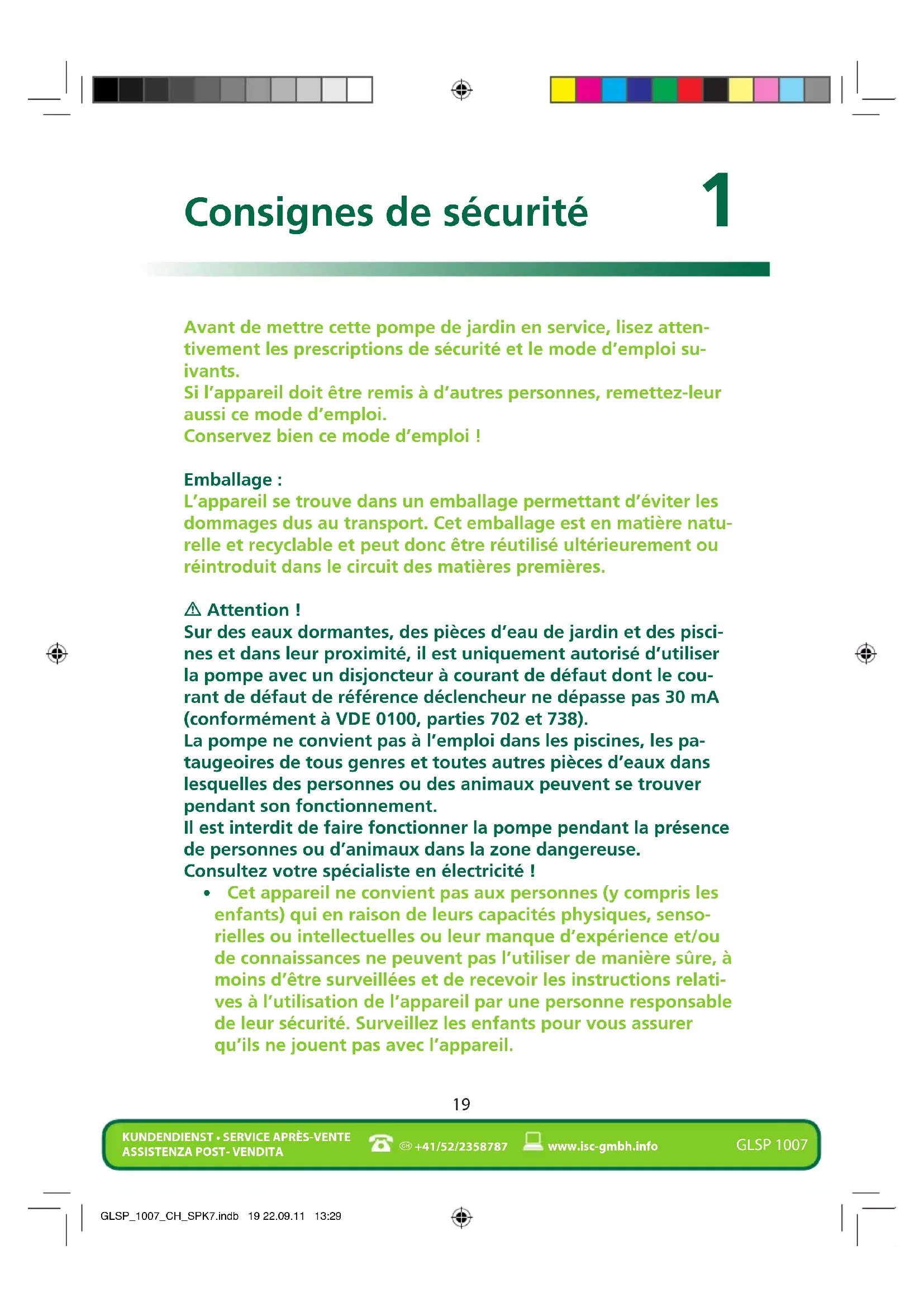 +41/52/2358787 www.isc-gmbh.info GLSP 1007 Avant de mettre cette pompe de jardin en service, lisez atten- tivement les prescriptions de sécurité et le mode d’emploi su- ivants. Si l’appareil doit être remis à d’autres personnes, remettez-leur aussi ce mode d’emploi. Conservez bien ce mode d’emploi ! Emballage : L’appareil se trouve dans un emballage permettant d’éviter les dommages dus au transport. Cet emballage est en matière natu- relle et recyclable et peut donc être réutilisé ultérieurement ou réintroduit dans le circuit des matières premières. m Attention ! Sur des eaux dormantes, des pièces d’eau de jardin et des pisci- nes et dans leur proximité, il est uniquement autorisé d’utiliser la pompe avec un disjoncteur à courant de défaut dont le cou- rant de défaut de référence déclencheur ne dépasse pas 30 mA (conformément à VDE 0100, parties 702 et 738). La pompe ne convient pas à l’emploi dans les piscines, les pa- taugeoires de tous genres et toutes autres pièces d’eaux dans lesquelles des personnes ou des animaux peuvent se trouver pendant son fonctionnement. Il est interdit de faire fonctionner la pompe pendant la présence de personnes ou d’animaux dans la zone dangereuse. Consultez votre spécialiste en électricité !