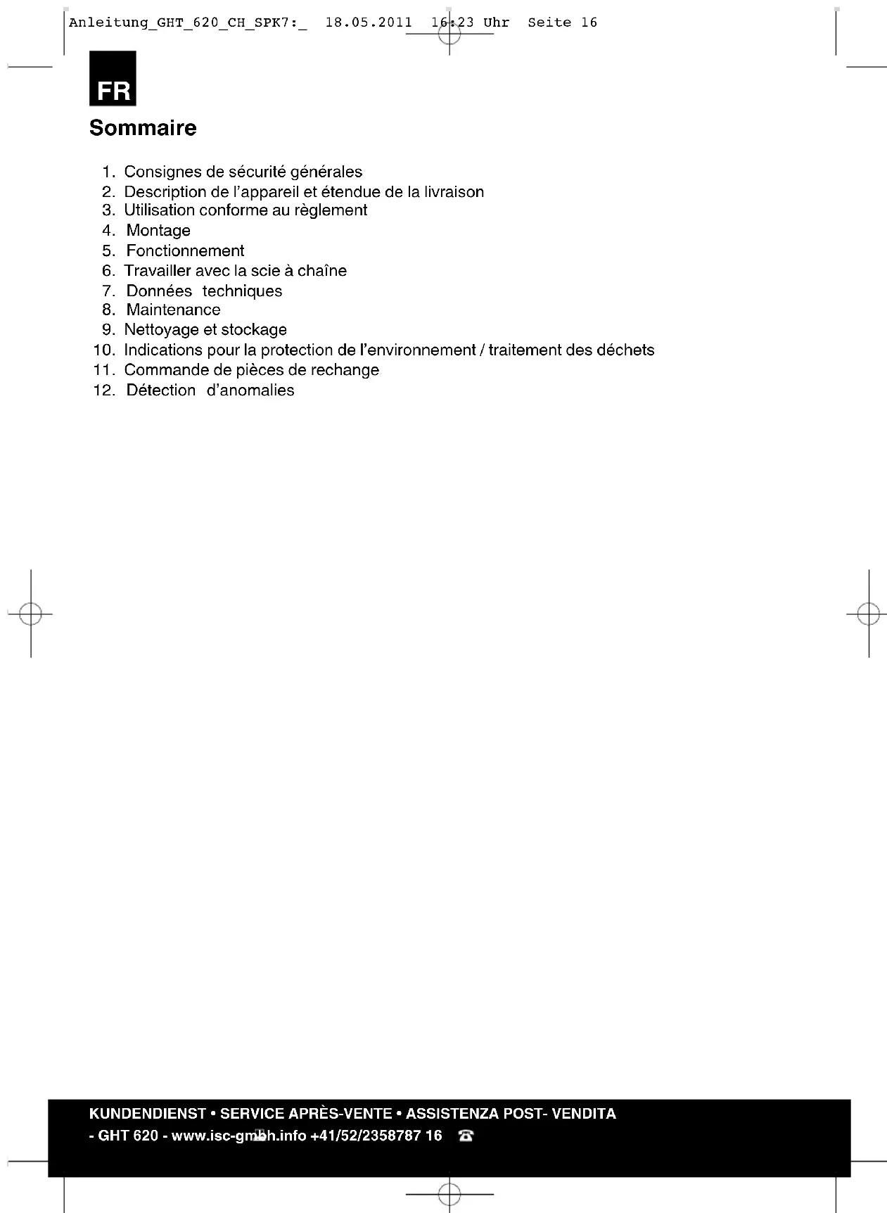 KUNDENDIENST • SERVICE APRÈS-VENTE • ASSISTENZA POST- VENDITA - GHT 620 - www.isc-gmbh.info +41/52/2358787 17 Anleitung_GHT_620_CH_SPK7:_ 18.05.2011 16:23 Uhr Seite 17responsabilité et lʼopérateur/lʼexploitant est responsable. Veillez au fait que nos appareils, conformément au règlement, n’ont pas été conçus pour être utilisés dans un environnement professionnel, industriel ou artisanal. Nous déclinons toute responsabilité si l’appareil venait à être utilisé professionnellement, artisanalement ou par des sociétés industrielles, tout comme pour toute activité équivalente.