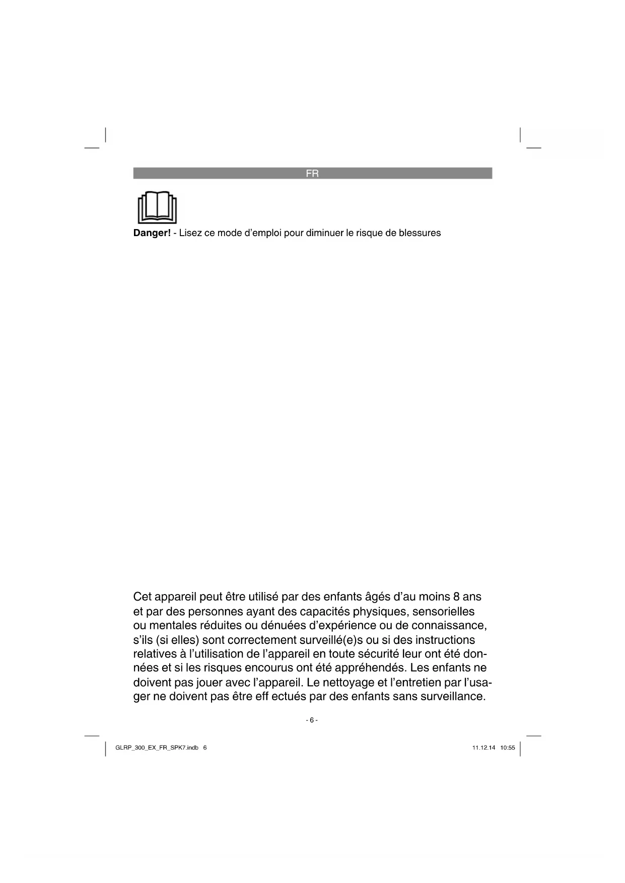 Danger! - Lisez ce mode d’emploi pour diminuer le risque de blessures Cet appareil peut être utilisé par des enfants âgés d’au moins 8 ans et par des personnes ayant des capacités physiques, sensorielles ou mentales réduites ou dénuées d’expérience ou de connaissance, s’ils (si elles) sont correctement surveillé(e)s ou si des instructions relatives à l’utilisation de l’appareil en toute sécurité leur ont été don- nées et si les risques encourus ont été appréhendés. Les enfants ne doivent pas jouer avec l’appareil. Le nettoyage et l’entretien par l’usa- ger ne doivent pas être eff ectués par des enfants sans surveillance. GLRP_300_EX_FR_SPK7.indb 6GLRP_300_EX_FR_SPK7.indb 6 11.12.14 10:5511.12.14 10:55FR