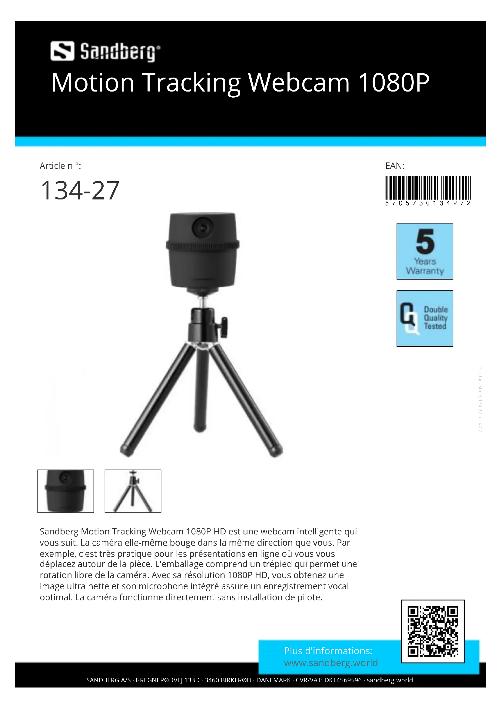 Sandberg Motion Tracking Webcam 1080P HD est une webcam intelligente qui vous suit. La caméra elle-même bouge dans la même direction que vous. Par exemple, c'est très pratique pour les présentations en ligne où vous vous déplacez autour de la pièce. L'emballage comprend un trépied qui permet une rotation libre de la caméra. Avec sa résolution 1080P HD, vous obtenez une image ultra nette et son microphone intégré assure un enregistrement vocal optimal. La caméra fonctionne directement sans installation de pilote. Product Sheet 134-27 fr - v2.2