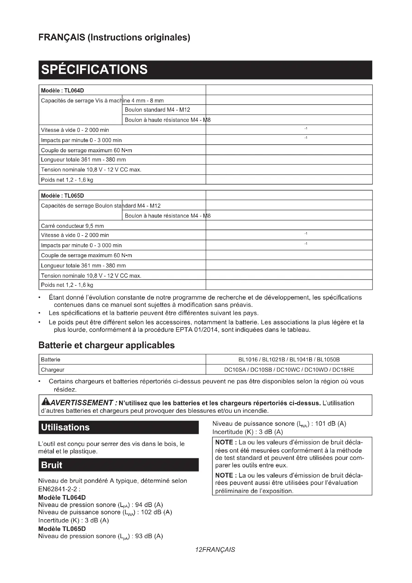 d’autres batteries et chargeurs peut provoquer des blessures et/ou un incendie. Utilisations L’outil est conçu pour serrer des vis dans le bois, le métal et le plastique. Bruit NiveaudebruitpondéréAtypique,déterminéselon EN62841-2-2 : Modèle TL064D Niveaudepressionsonore(L