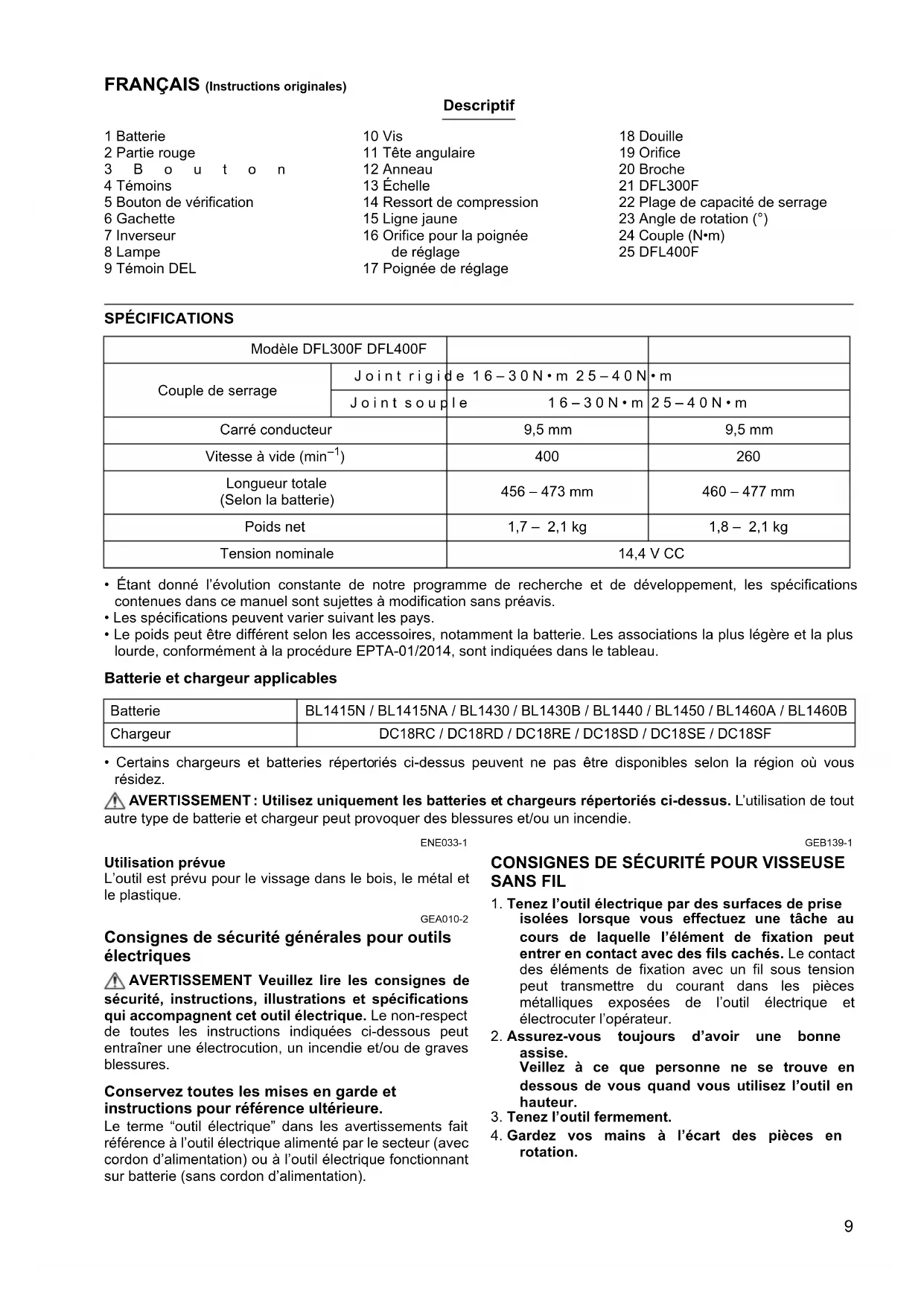 For European countries only The EC declaration of conformity is included as Annex A to this instruction manual.9 FRANÇAIS (Instructions originales) Descriptif 1 Batterie 2 Partie rouge 3Bouton 4 Témoins 5 Bouton de vérification 6 Gachette 7 Inverseur 8 Lampe 9 Témoin DEL 10 Vis 11 Tête angulaire 12 Anneau 13 Échelle 14 Ressort de compression 15 Ligne jaune 16 Orifice pour la poignée de réglage 17 Poignée de réglage 18 Douille 19 Orifice 20 Broche 21 DFL300F 22 Plage de capacité de serrage 23 Angle de rotation (°) 24 Couple (N•m) 25 DFL400F SPÉCIFICATIONS