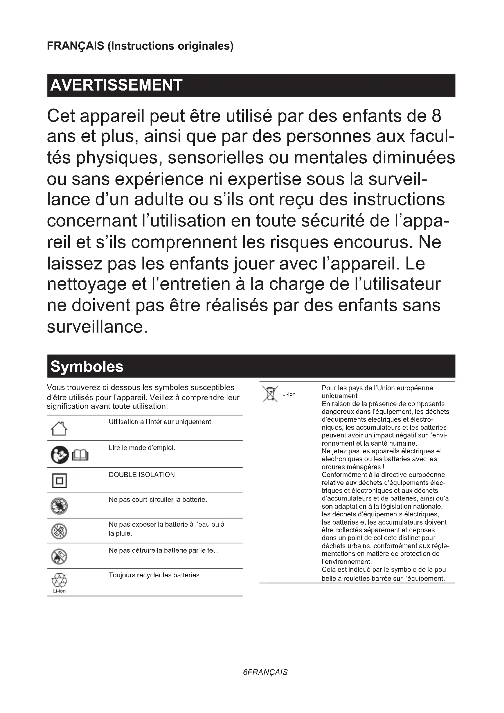 - 64 V (max.) 32 BL6440 4.0 120 NOTICE: The battery charger is for charging Makita-battery cartridge. Never use it for other purposes or for other manufacturer’s batteries. NOTE: If the charging light ashes in red color, charging may not start due to the condition of the battery cartridge as below: — Battery cartridge from just-operated tool or battery cartridge that has been left in a location exposed to direct sunlight for a long time. — Battery cartridge that has been left for a long time in a location exposed to cold air. NOTE: When the battery cartridge is too hot, charging does not begin until the battery cartridge temperature reaches the degree at which charging is possible. NOTE: If the charging light ashes alternately in green and red color, charging is not possible. The terminals on the charger or battery cartridge are clogged with dust or the battery cartridge is worn out or damaged.6 FRANÇAIS FRANÇAIS (Instructions originales) AVERTISSEMENT Cet appareil peut être utilisé par des enfants de 8 ans et plus, ainsi que par des personnes aux facul- tés physiques, sensorielles ou mentales diminuées ou sans expérience ni expertise sous la surveil- lance d’un adulte ou s’ils ont reçu des instructions concernant l’utilisation en toute sécurité de l’appa- reil et s’ils comprennent les risques encourus. Ne laissez pas les enfants jouer avec l’appareil. Le nettoyage et l’entretien à la charge de l’utilisateur ne doivent pas être réalisés par des enfants sans surveillance. Symboles Vous trouverez ci-dessous les symboles susceptibles d’être utilisés pour l’appareil. Veillez à comprendre leur signication avant toute utilisation. Utilisation à l’intérieur uniquement. Lire le mode d’emploi. DOUBLE ISOLATION Ne pas court-circuiter la batterie. Ne pas exposer la batterie à l’eau ou à la pluie. Ne pas détruire la batterie par le feu. Toujours recycler les batteries. Li-ion Pour les pays de l’Union européenne uniquement En raison de la présence de composants dangereux dans l’équipement, les déchets d’équipements électriques et électro- niques, les accumulateurs et les batteries peuvent avoir un impact négatif sur l’envi- ronnement et la santé humaine. Ne jetez pas les appareils électriques et électroniques ou les batteries avec les ordures ménagères ! Conformément à la directive européenne relative aux déchets d’équipements élec- triques et électroniques et aux déchets d’accumulateurs et de batteries, ainsi qu’à son adaptation à la législation nationale, les déchets d’équipements électriques, les batteries et les accumulateurs doivent être collectés séparément et déposés dans un point de collecte distinct pour déchets urbains, conformément aux régle- mentations en matière de protection de l’environnement. Cela est indiqué par le symbole de la pou- belle à roulettes barrée sur l’équipement.7 FRANÇAIS ► Fig.1 Prêt à charger. Charge retardée (batterie trop chaude ou trop froide). Charge en cours (0 - 80 %). Charge en cours (80 - 100 %). Charge terminée. Batterie défectueuse. ATTENTION