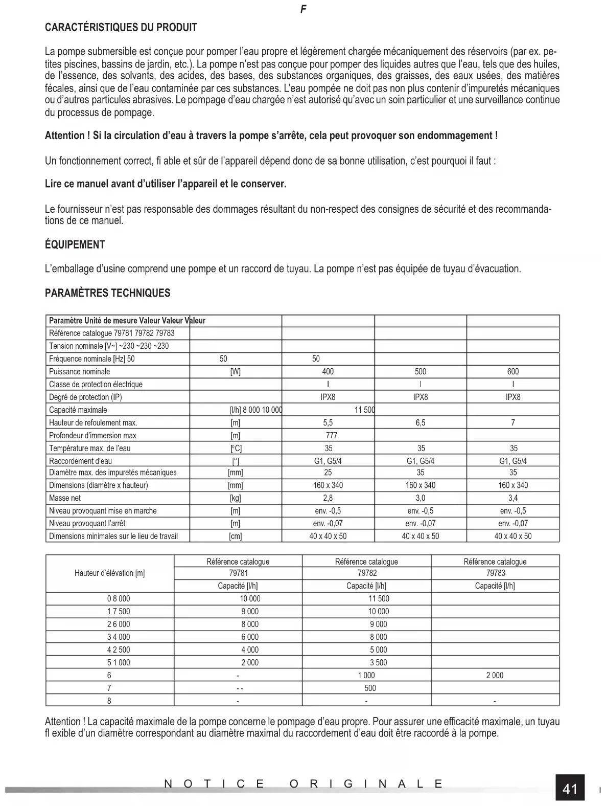 Paramètre Unité de mesure Valeur Valeur Valeur Référence catalogue 79781 79782 79783 Tension nominale [V~] ~230 ~230 ~230 Fréquence nominale [Hz] 50 50 50 Puissance nominale [W] 400 500 600 Classe de protection électrique I I I Degré de protection (IP) IPX8 IPX8 IPX8 Capacité maximale [l/h] 8 000 10 000 11 500 Hauteur de refoulement max. [m] 5,5 6,5 7 Profondeur d’immersion max [m] 777 Température max. de l’eau [