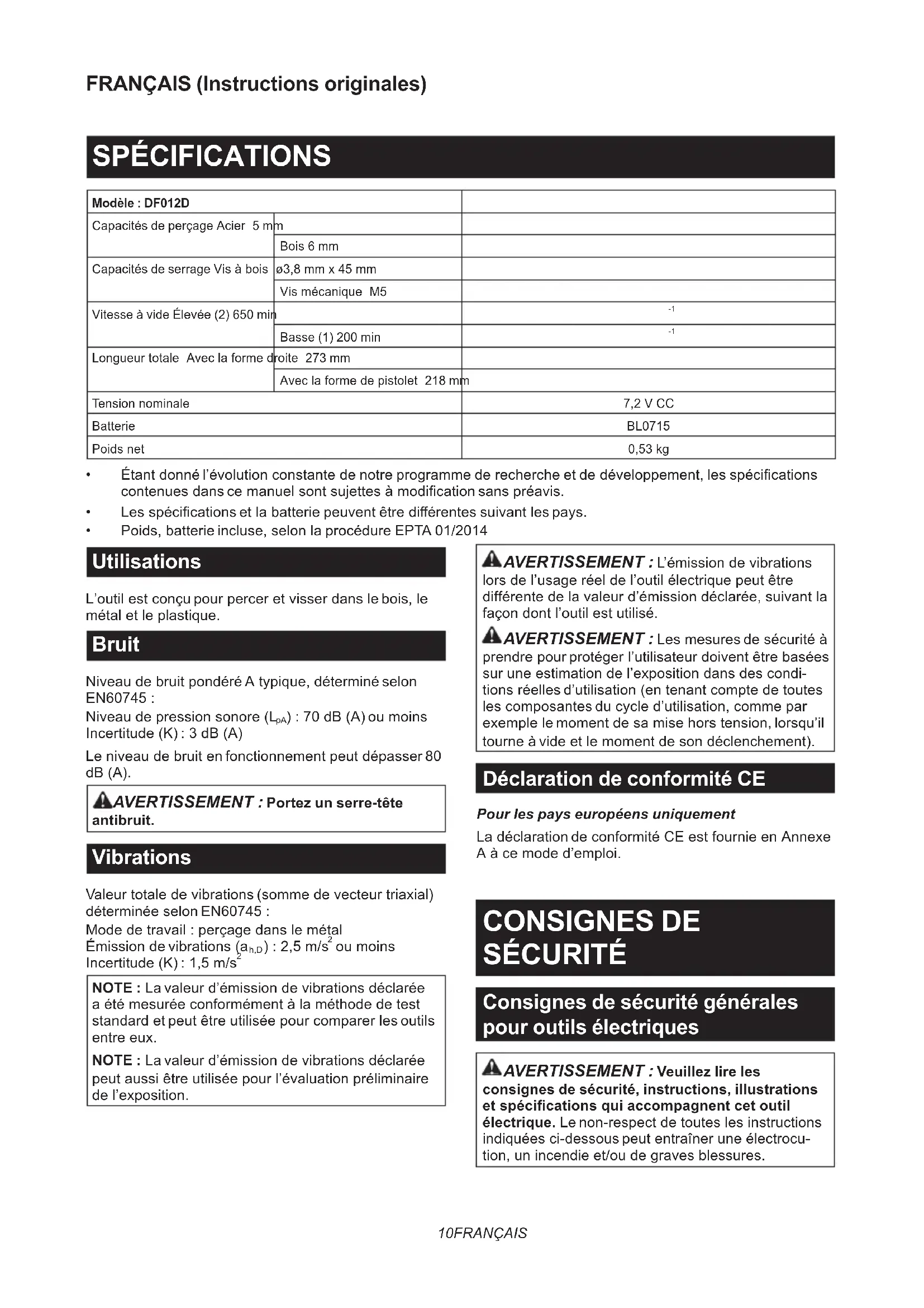 prendrepourprotégerl’utilisateurdoiventêtrebasées suruneestimationdel’expositiondansdescondi- tionsréellesd’utilisation(entenantcomptedetoutes lescomposantesducycled’utilisation,commepar exemplelemomentdesamisehorstension,lorsqu’il tourneàvideetlemomentdesondéclenchement). Déclaration de conformité CE Pour les pays européens uniquement LadéclarationdeconformitéCEestfournieenAnnexe Aàcemoded’emploi. CONSIGNES DE SÉCURITÉ Consignes de sécurité générales pour outils électriques