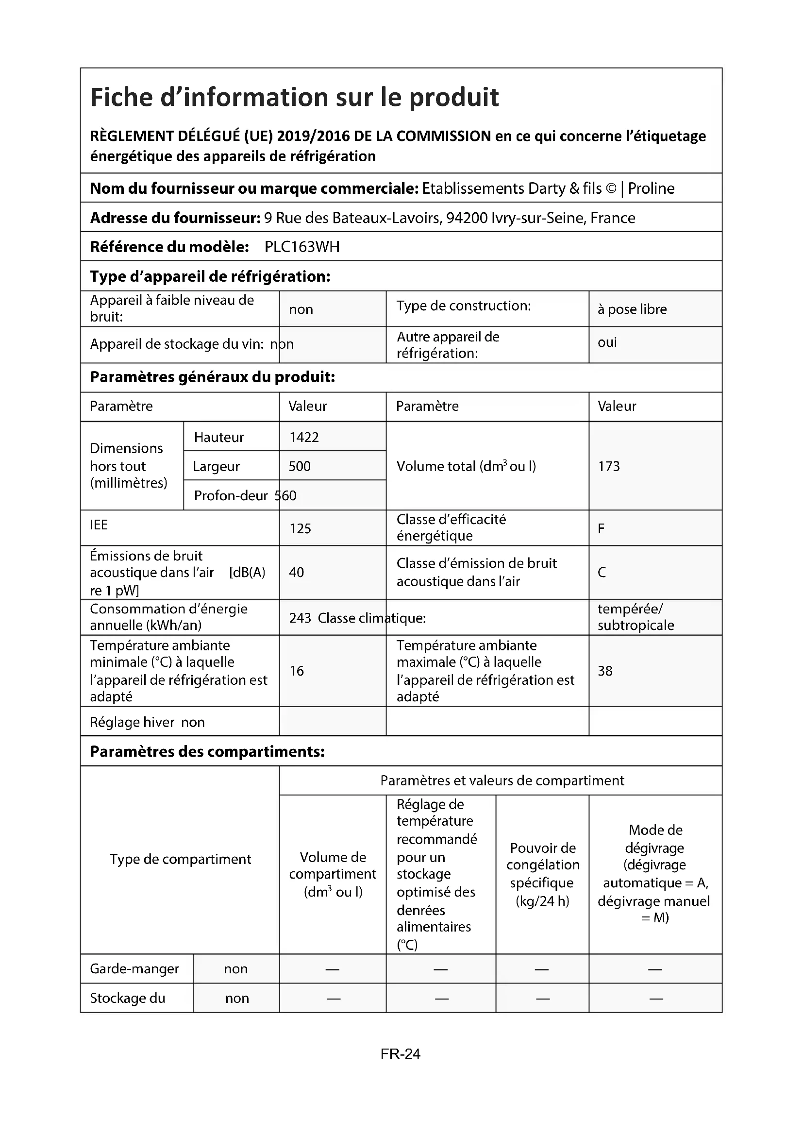 Entrée de puissance nominale Puissance maximale de la lampe .5 Réfrigérant/Quantité FR-23Fiche d’information sur le produit RÈGLEMENT DÉLÉGUÉ (UE) 2019/2016 DE LA COMMISSION en ce qui concerne l’étiquetage énergétique des appareils de réfrigération Nom du fournisseur ou marque commerciale: Etablissements Darty & fils © | Proline Adresse du fournisseur: 9 Rue des Bateaux-Lavoirs, 94200 Ivry-sur-Seine, France Référence du modèle: PLC163WH Type d’appareil de réfrigération: Appareil à faible niveau de bruit: non Type de construction: à pose libre Appareil de stockage du vin: non Autre appareil de réfrigération: oui Paramètres généraux du produit: Paramètre Valeur Paramètre Valeur Dimensions hors tout (millimètres) Hauteur